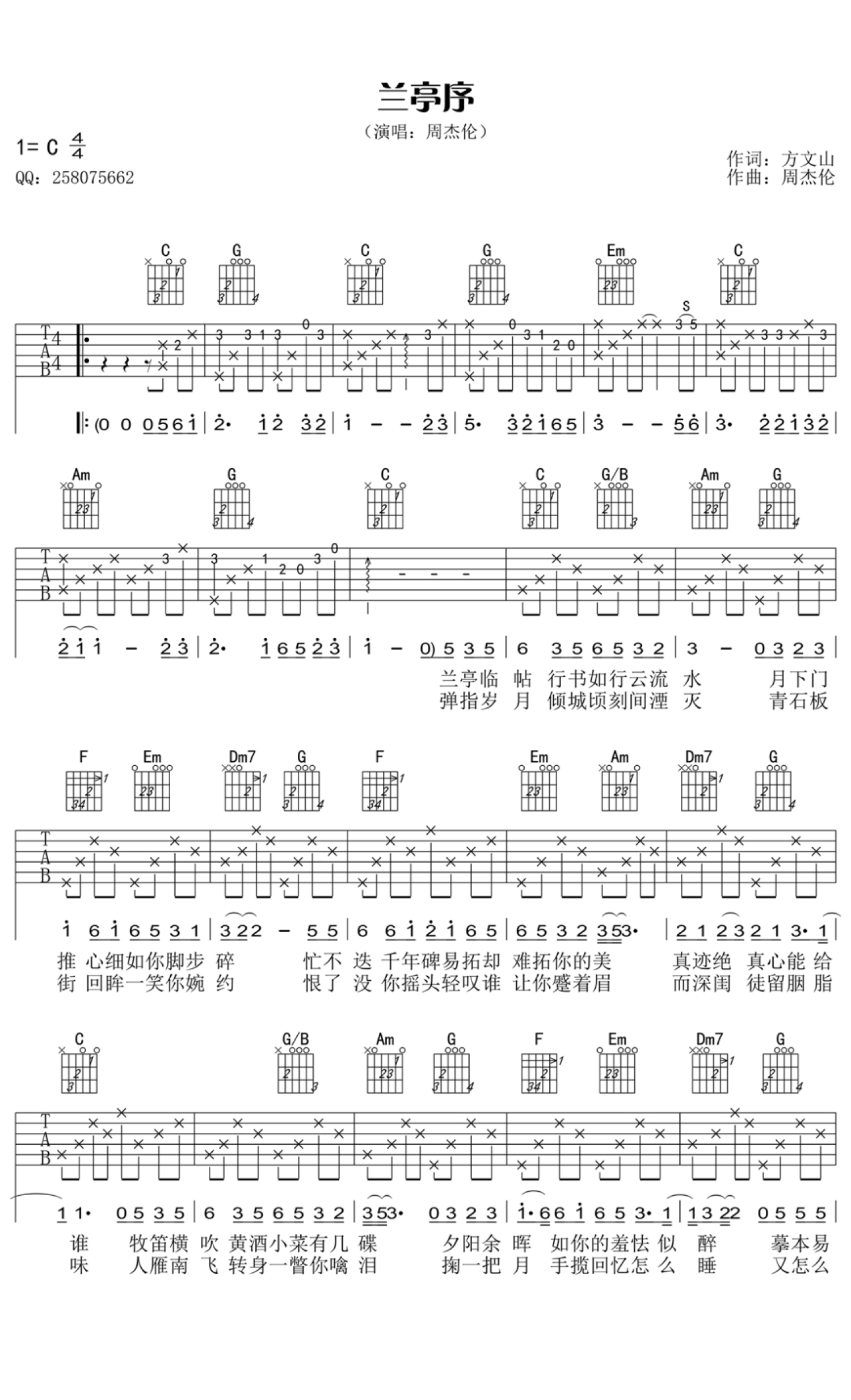 兰亭序吉他谱 - 周杰伦 - C调吉他弹唱谱