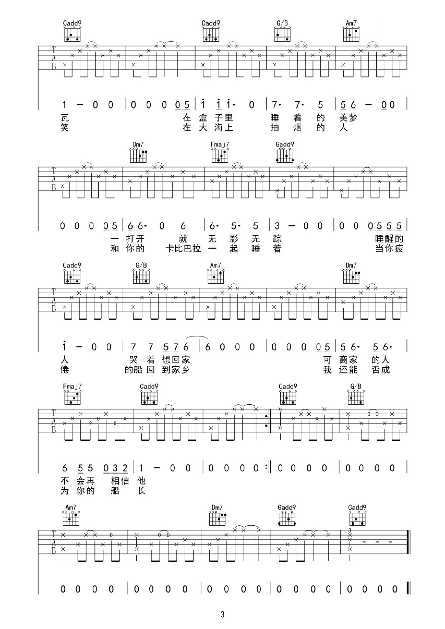 曲谱介绍: 宋冬野《卡比巴拉的海》吉他谱_C调吉他弹唱谱