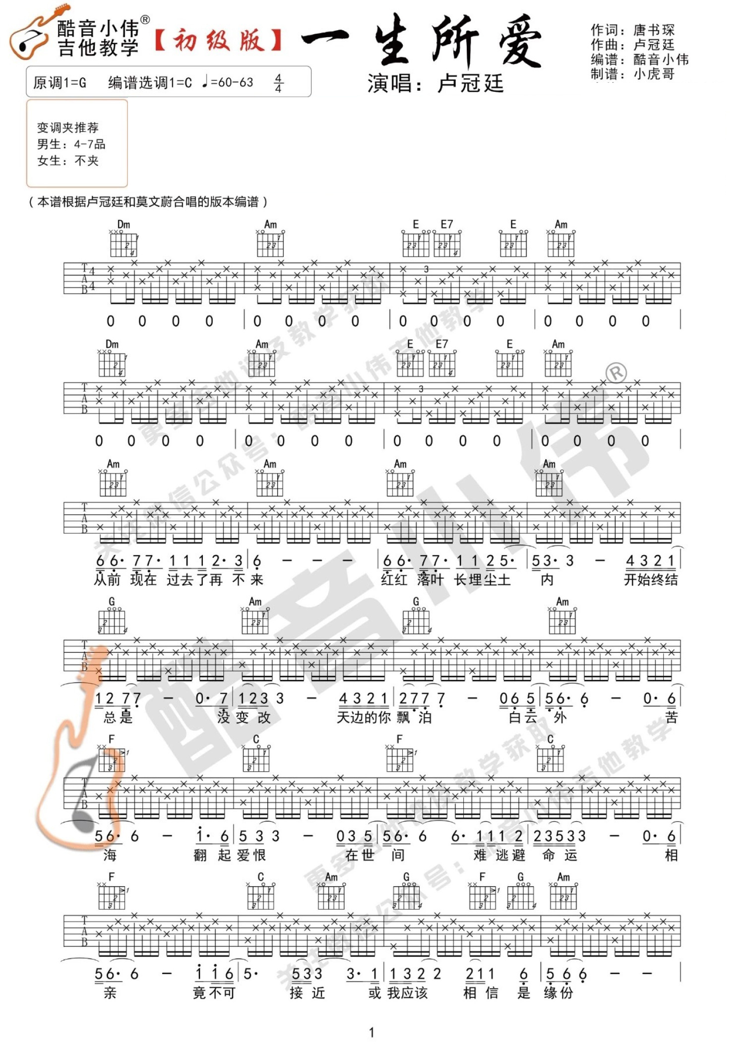 曲谱介绍: 卢冠廷《一生所爱》吉他谱_C调吉他弹唱谱_初级版
