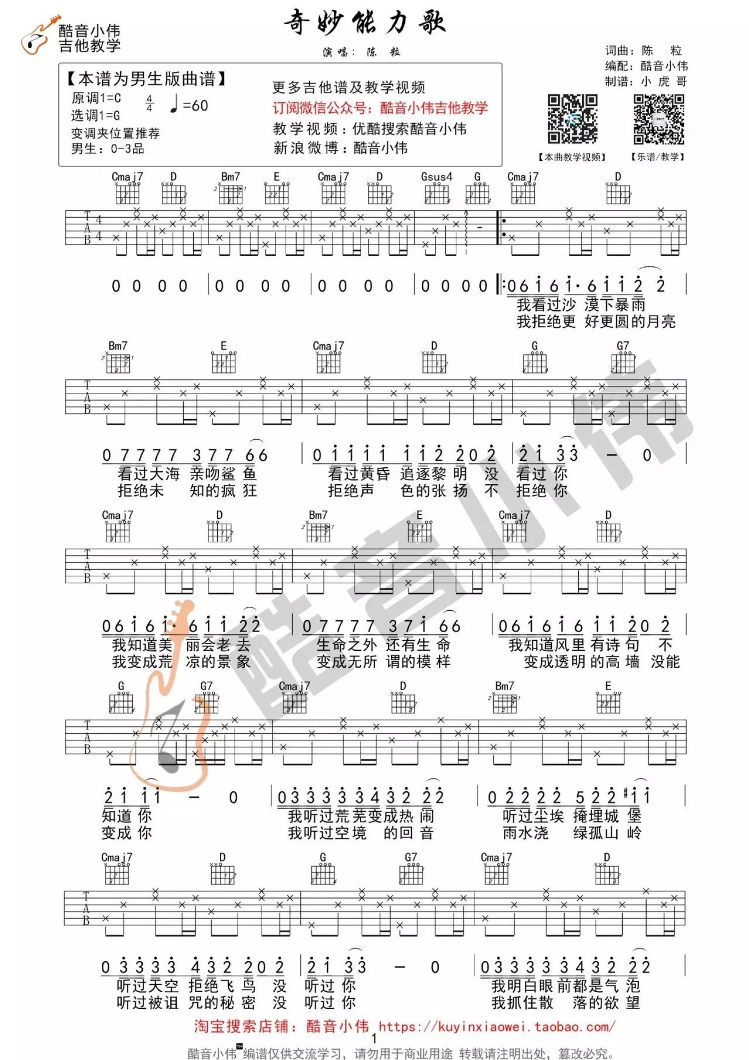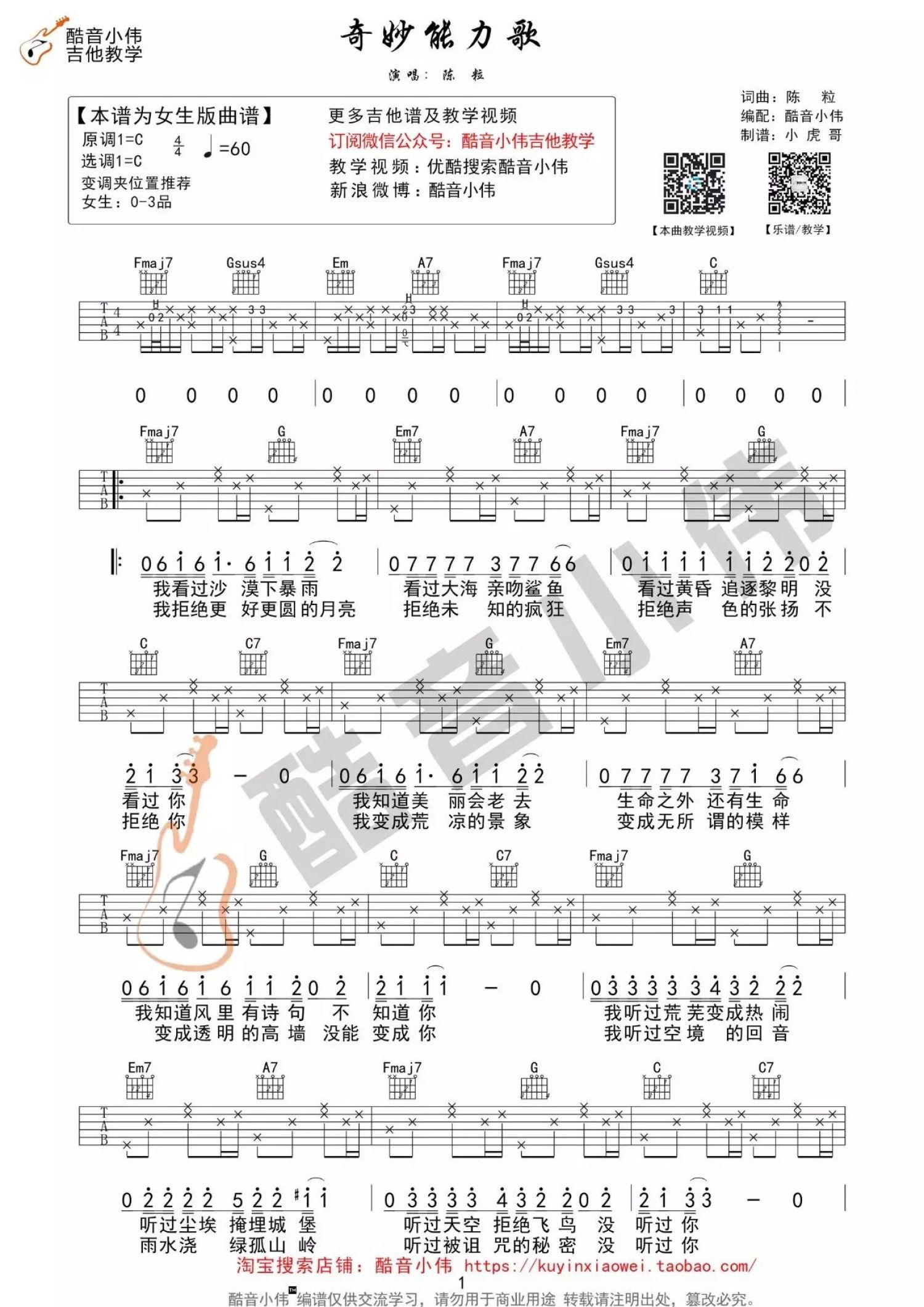 曲谱介绍: 陈粒《奇妙能力歌》,我拥有好多奇妙的能力,却没能拥有你。非常受欢迎的一首清新民谣,陈粒老练达观的冷艳安安静静地弹唱,干干净净的嗓音,简简单单的和弦伴奏,娓娓唱出小女子色彩张扬的奇妙世界。来自酷音小伟编配《奇妙能力歌》吉他谱,附弹唱演示和教学视频。原曲里这首歌是没有前奏的,小伟老师把副歌的主旋律当做了前奏。谱子分C调女生版和G调男生版,都有对应的视频教学,喜欢的朋友不要错过了。C调女生版吉他谱《奇妙能力歌》吉他弹唱教学C调版G调男生版吉他谱《奇妙能力歌》吉他弹唱教学G调版