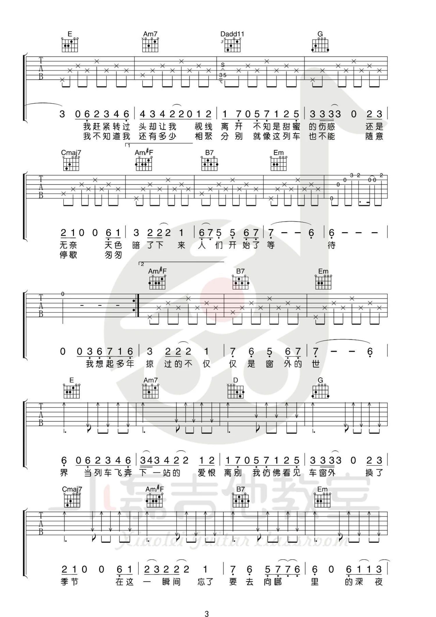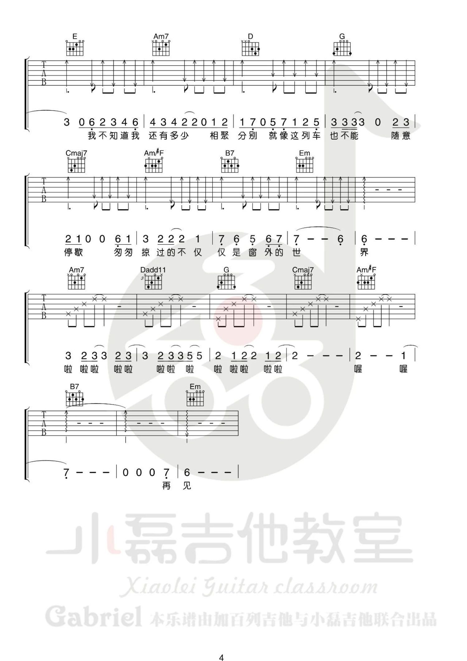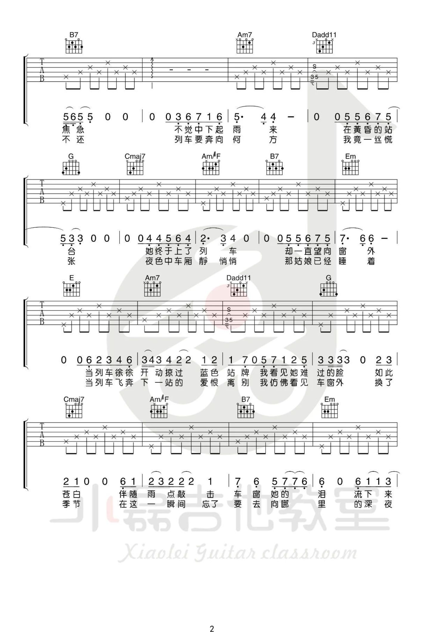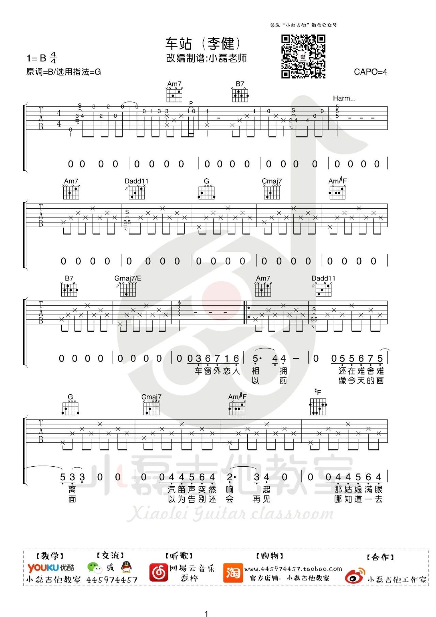 曲谱介绍: 悠扬的曲调让你不知不觉尝尽人生百味,或悲伤、或深情、或怀念······这首歌并没有正式的录音版本,只有一个现场版,是一首非常唯美的歌曲。《车站》吉他弹唱视频教程来自小磊吉他教室编配《车站》吉他谱,原版中的乐器编排比较清晰,没有太多复杂的东西,整体和弦走向也比较常见,我们总结的乐谱尽量保留了原版的前奏和和声走向,最大可能的降低了难度,后段加入的扫弦部分,也是比较契合边弹边唱的。希望大家都可以学习好这样一首歌曲。