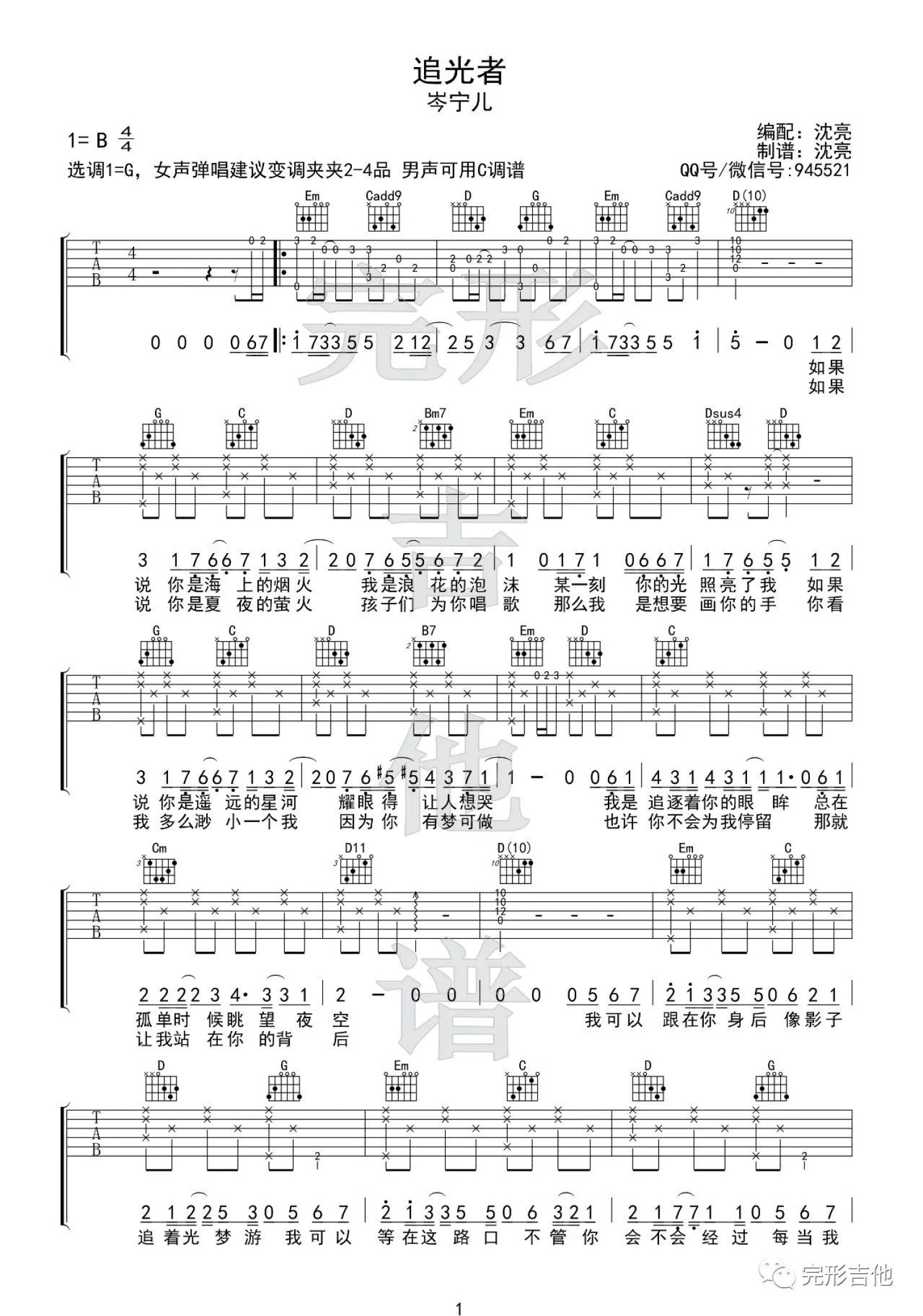 曲谱介绍: 岑宁儿《追光者》吉他谱_G调吉他弹唱谱