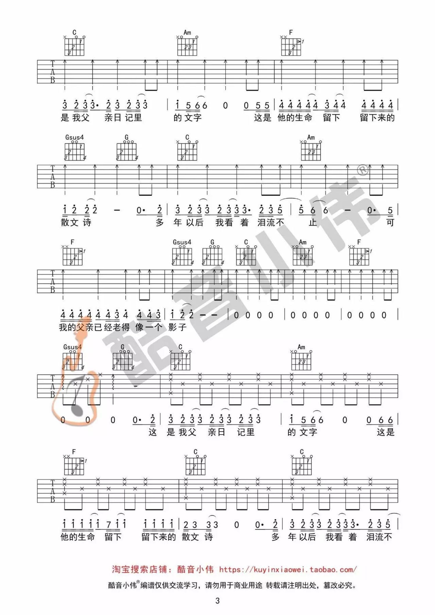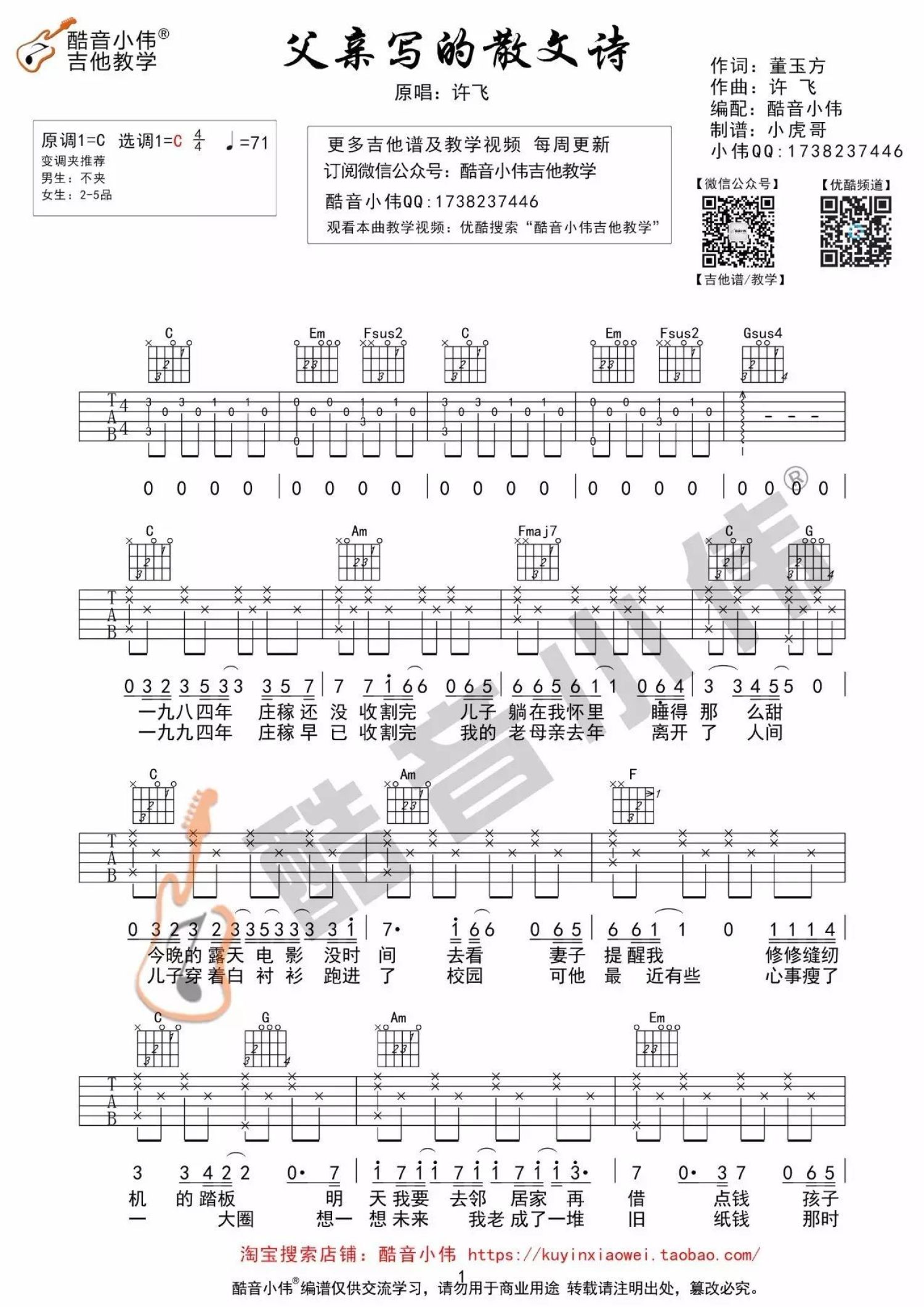 曲谱介绍: 许飞《父亲写的散文诗》吉他谱_C调吉他弹唱谱