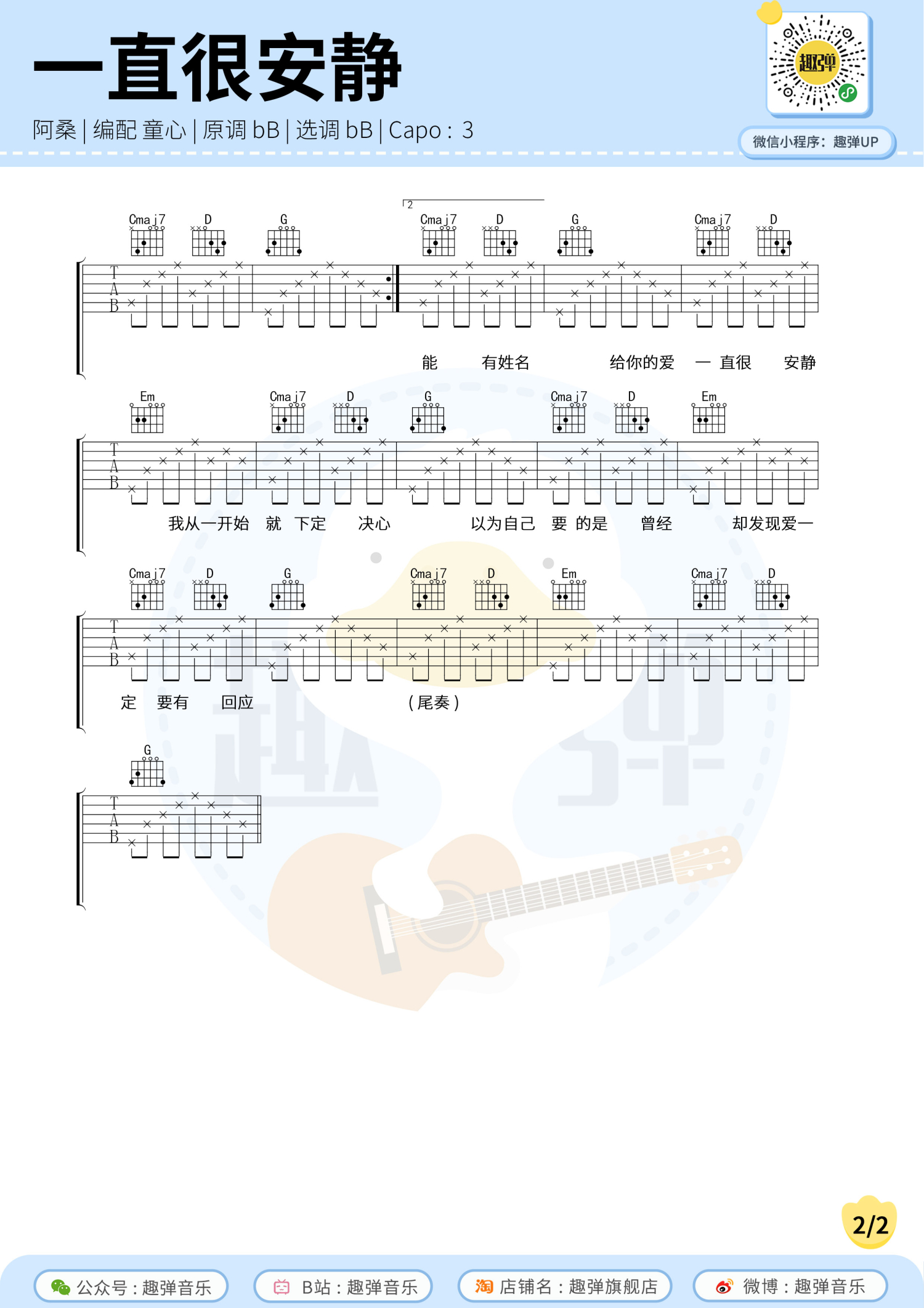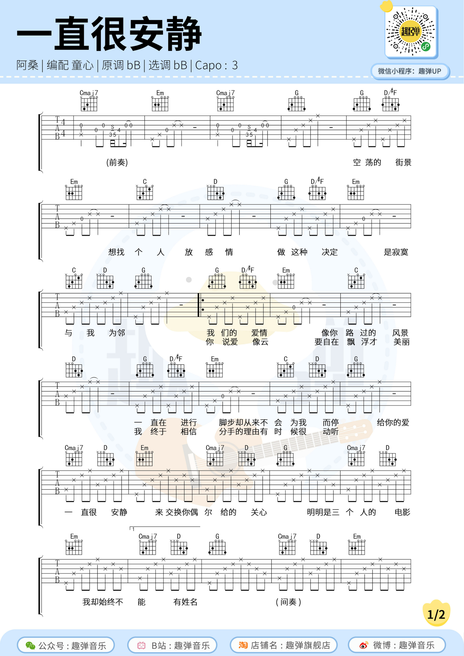 曲谱介绍: 阿桑绝唱《一直很安静》,电视剧《仙剑三》的插曲。给你的爱一直很安静,歌曲完美契合剧情就像林月如对李逍遥爱得刻骨铭心,却只能做个失魂落魄的局外人,爱情中多的是放不下又得不到,只能保持心底对你的爱,但一直很安静。原调bB调编配,附弹唱视频教程。男生弹唱推荐变调夹夹第三品,女生夹第五品,也可以根据个人嗓音调整。歌曲的前奏部分有点难,一些旋律音还有“滑音”,有点小复杂,但是多练一定能熟练!