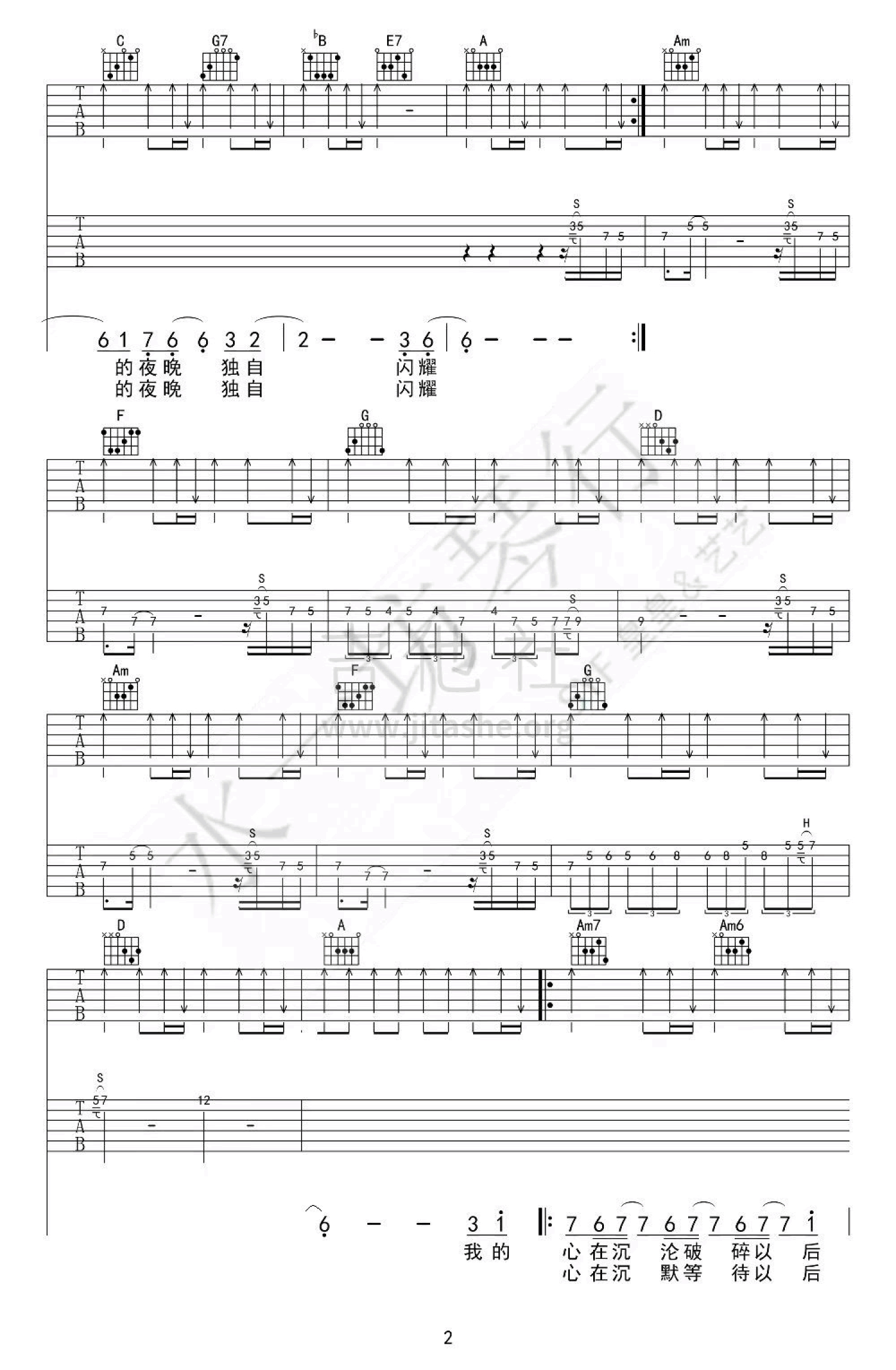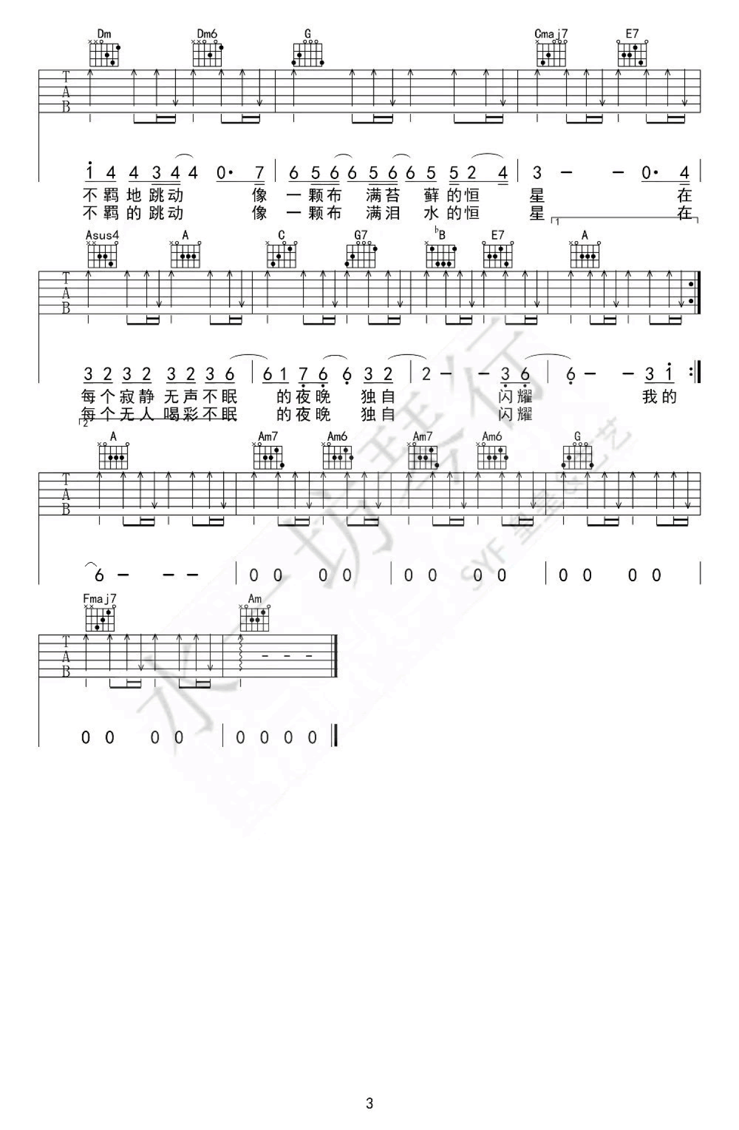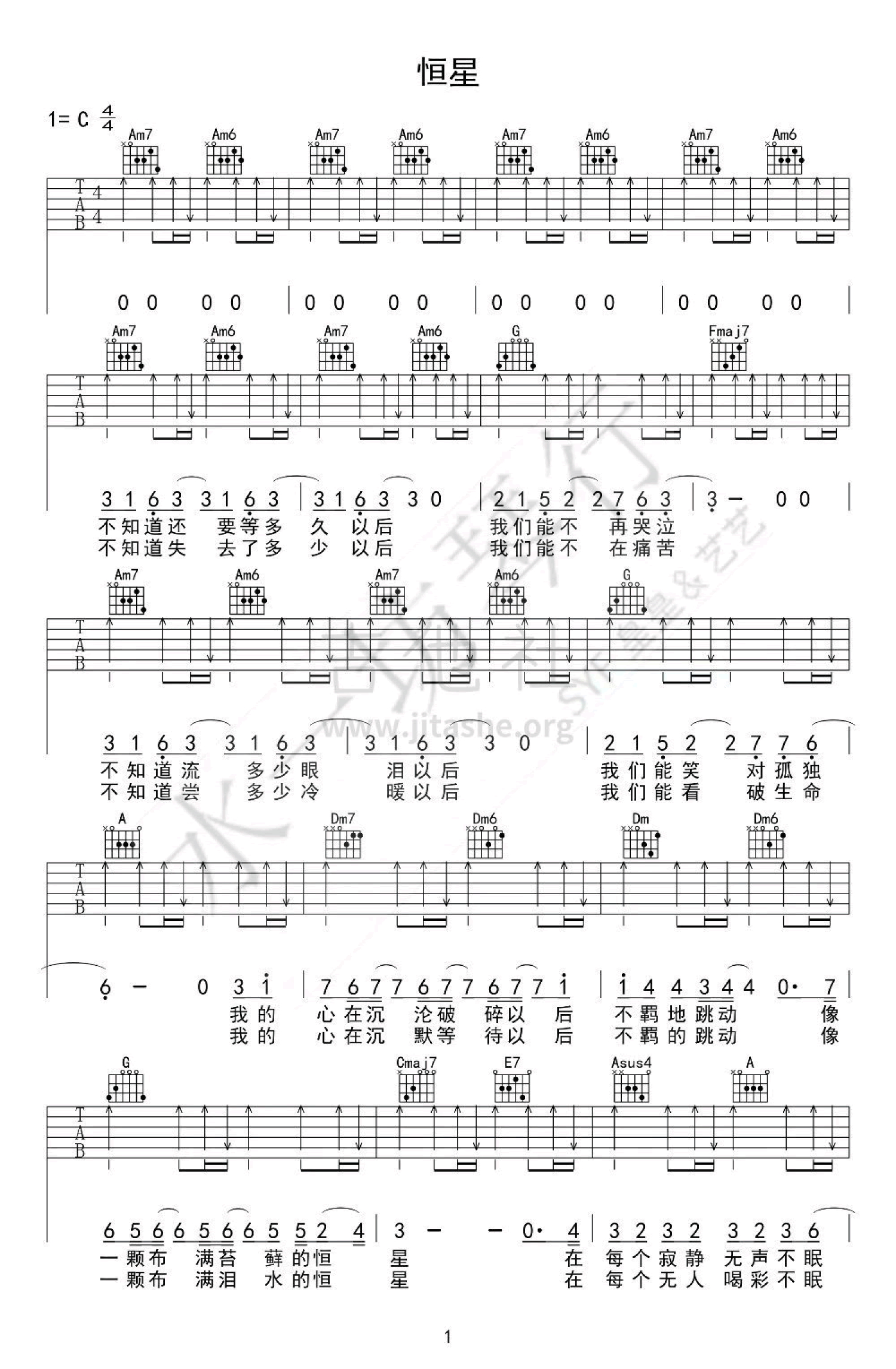 曲谱介绍: 恒星吉他谱,C调指法扫弦版,汪峰《怒放的生命》专辑中的一首歌曲,很温暖的慢歌,在好声音舞台上被多次翻唱,恒星六线谱,双吉他编配,我的心在沉沦破碎以后不羁的跳动,像一颗布满苔藓的恒星,在每个无人喝彩不眠的夜晚独自闪耀。尽管追梦路上伤痕累累,但永不放弃,不变初心,永远向着远方歌唱!