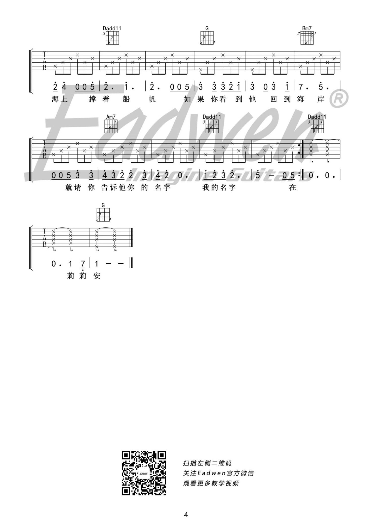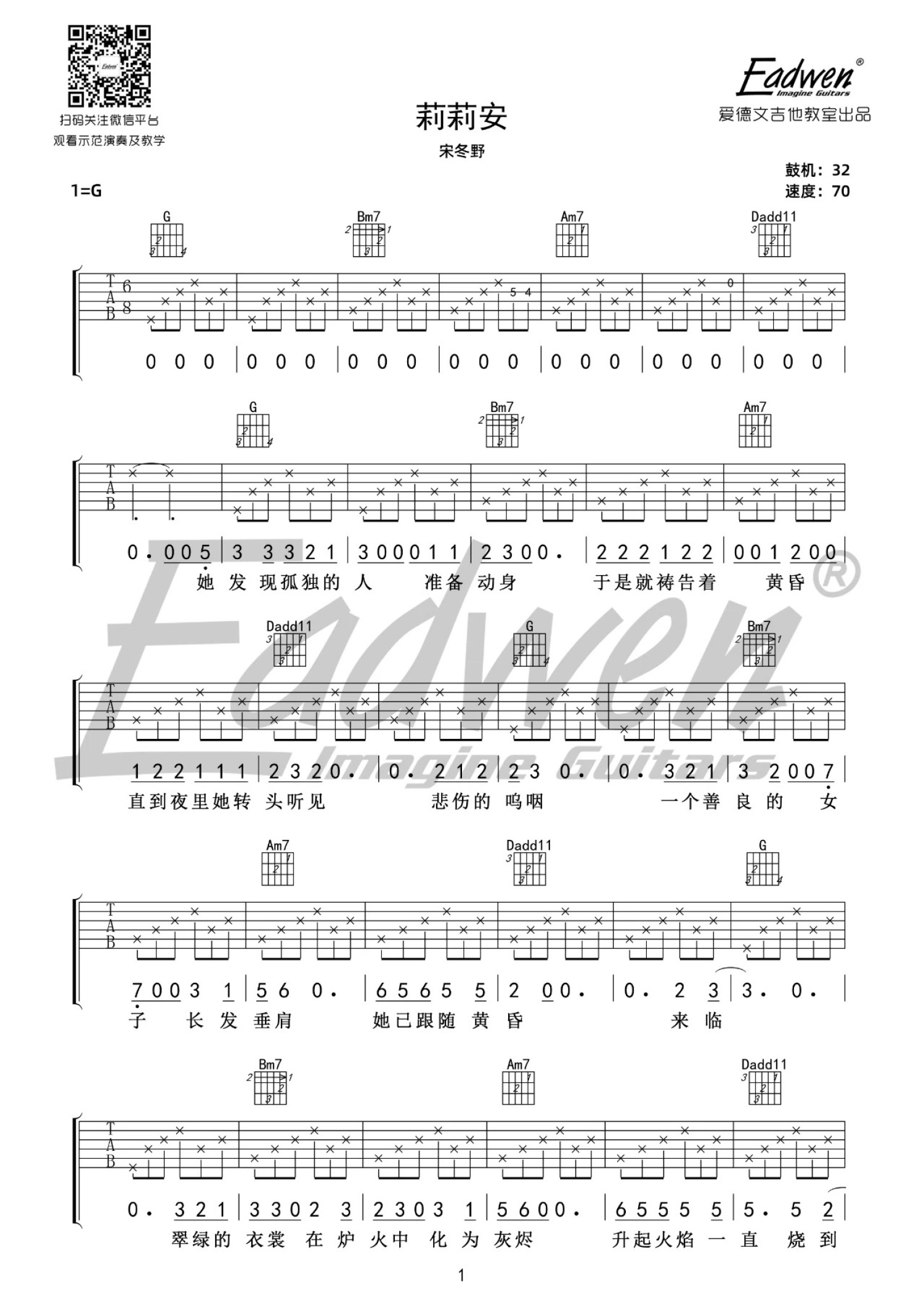 曲谱介绍: 宋冬野《莉莉安》吉他谱_G调吉他弹唱谱