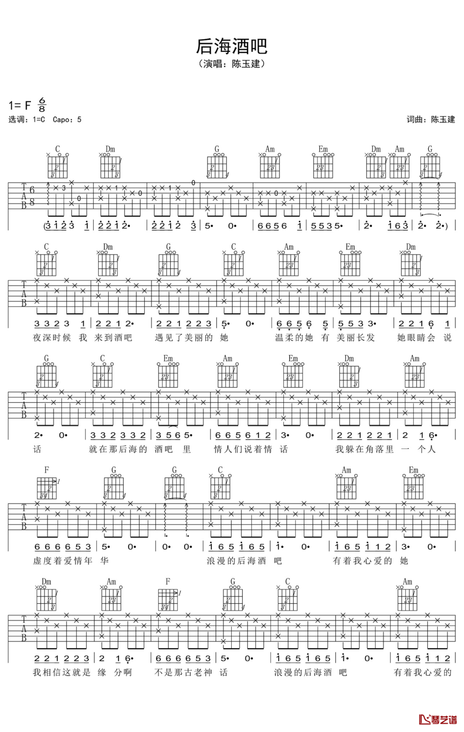 后海酒吧吉他谱 - 陈玉建 - C调吉他弹唱谱