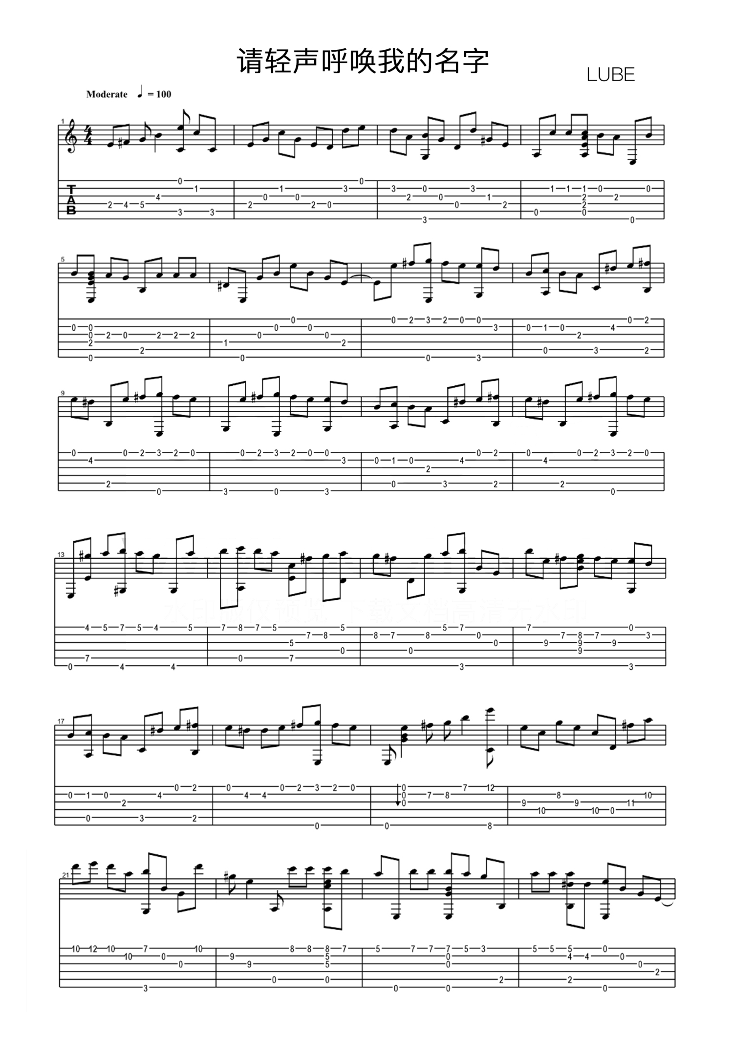 曲谱介绍: LUBE《请轻声呼唤我的名字》吉他谱_吉他独奏谱