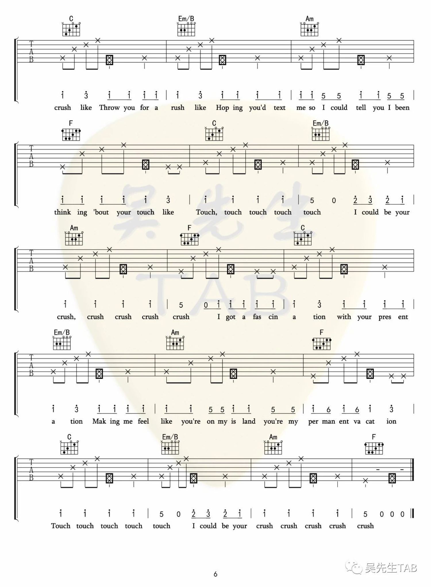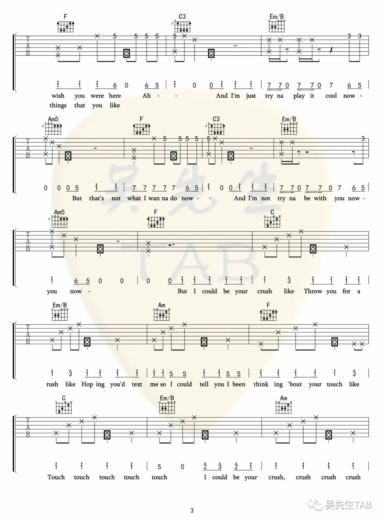 曲谱介绍: TessaViolet《Crush》,在听这首歌之前我一直用Crush来表达自己低落的心情,今天我才发现它还有暗恋迷恋之意。但Crush和爱的区别就在于,那份幻想还来不及变成行动,它就已经烟消云散。希望每个人都能遇见自己热烈地爱着的人。C调版吉他弹唱谱,篇幅较长但节奏不是很难。
