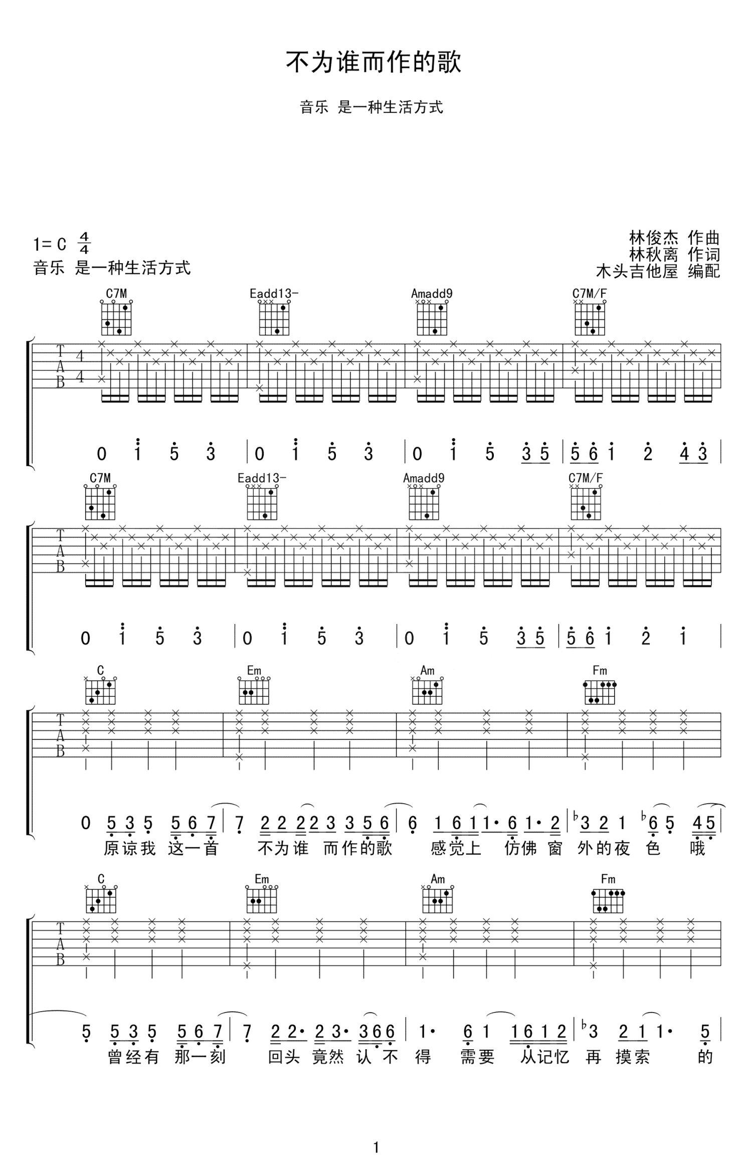 不为谁而作的歌吉他谱 - 林俊杰 - C调吉他弹唱谱