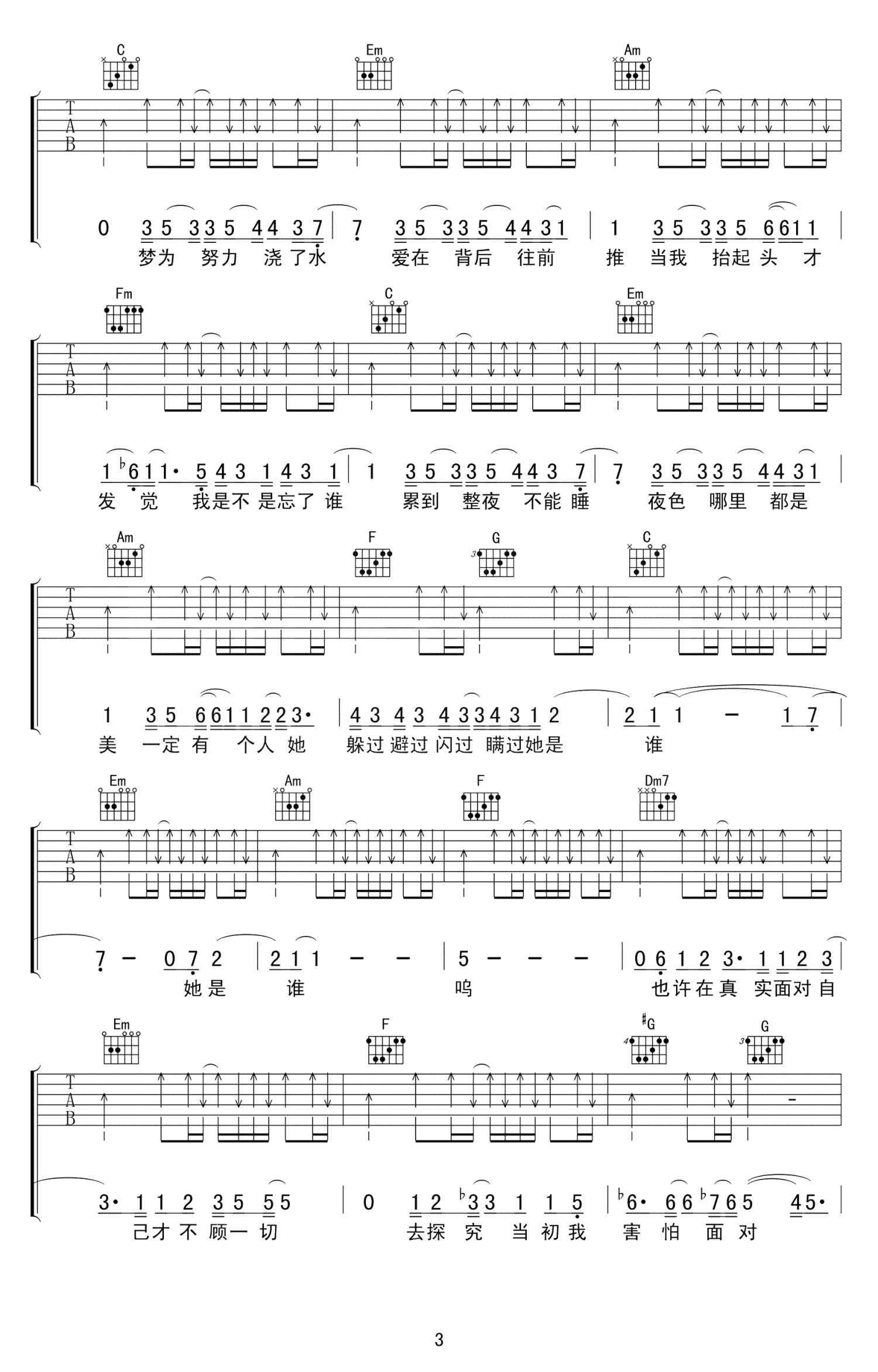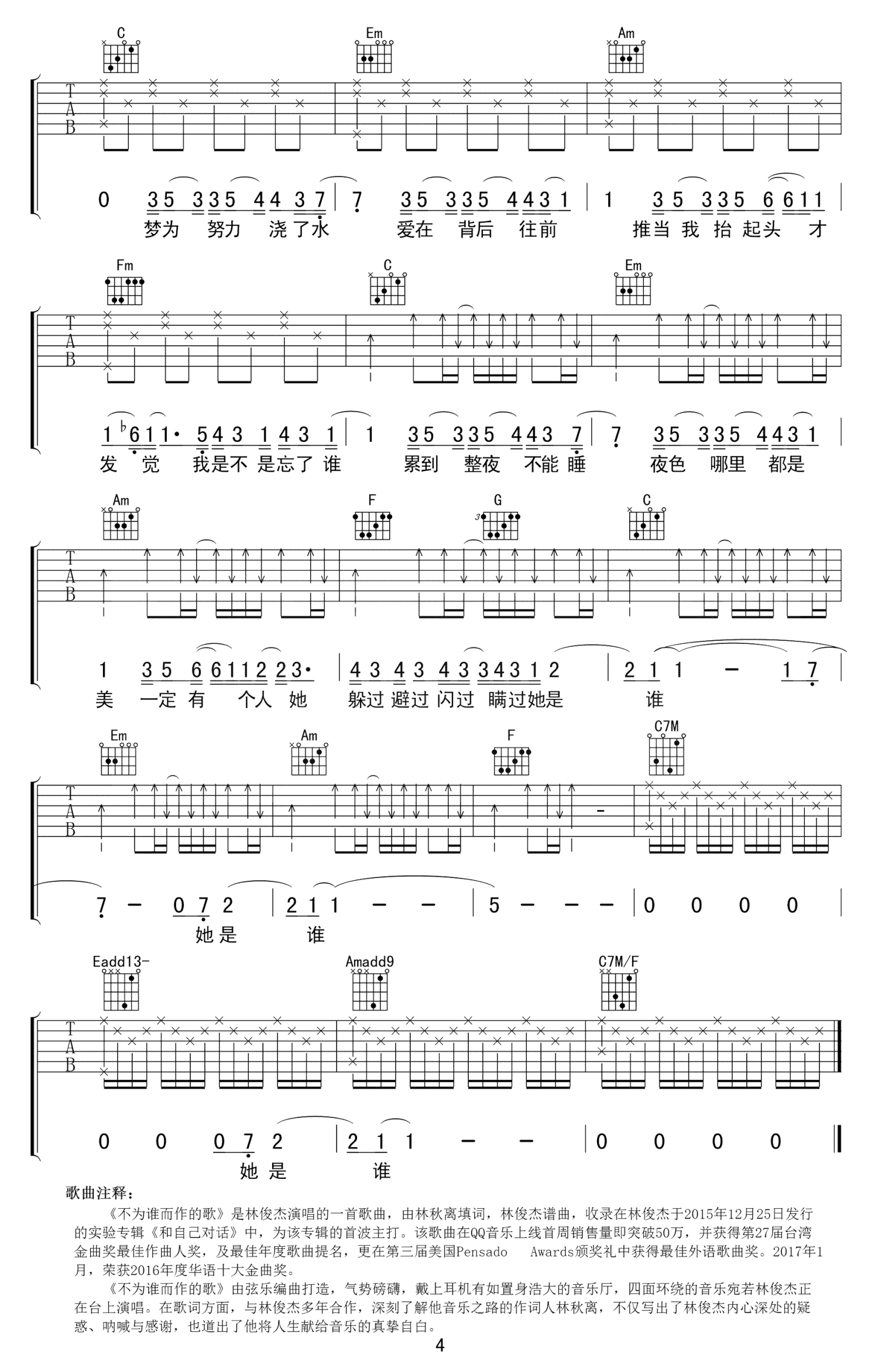 曲谱介绍: 这首歌就像是自己跟自己的对话,不断的反思,不断的感悟。不为谁而写的歌是写给我们每一个人的歌,里边有我们消沉低落的模样、有我们对梦想的坚持、有我们被身边人或陌生人感动到的泪光,这首歌里包含了太多太多的感情。