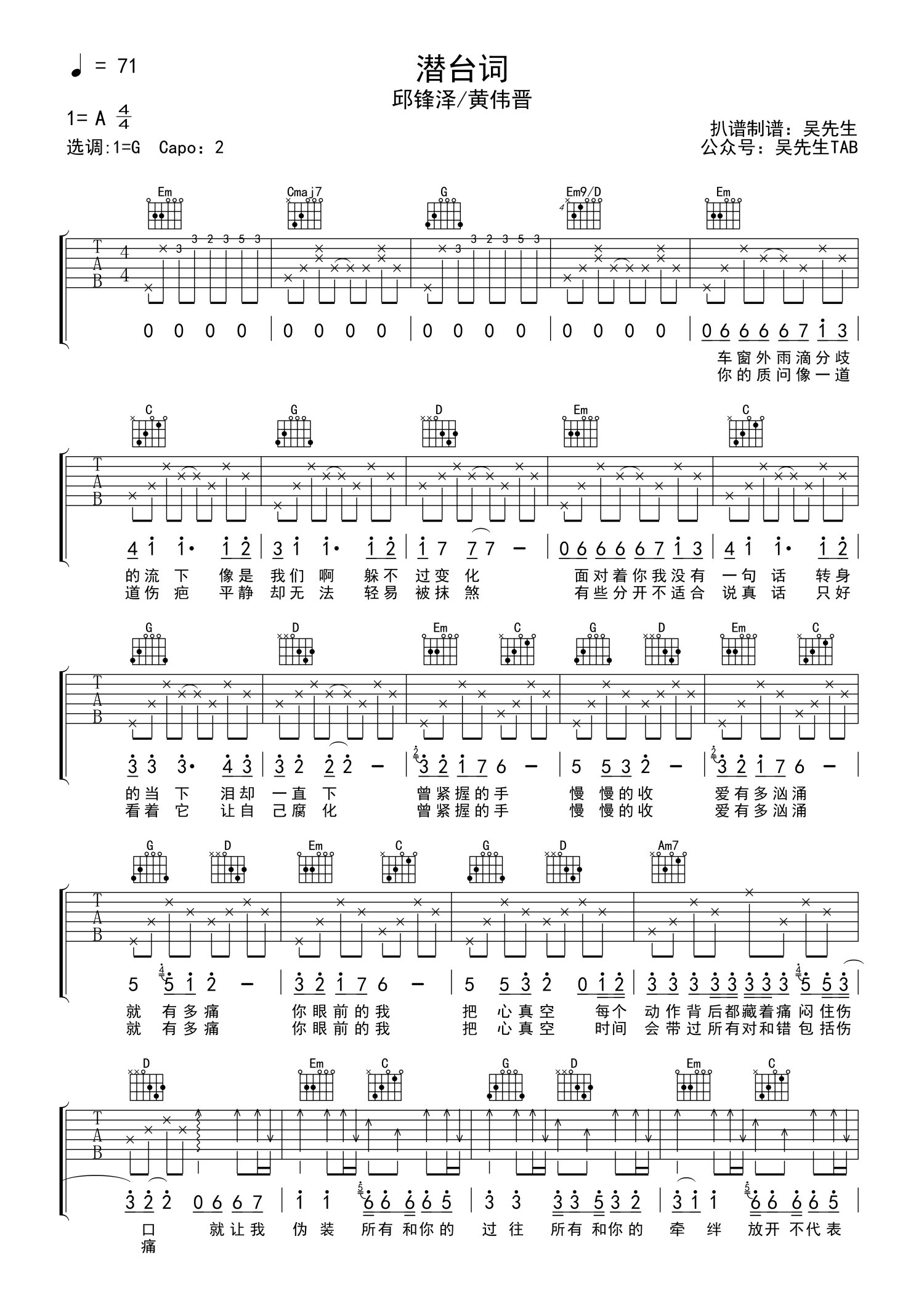 曲谱介绍: 邱锋泽/黄伟晋《潜台词》吉他谱_G调吉他弹唱谱