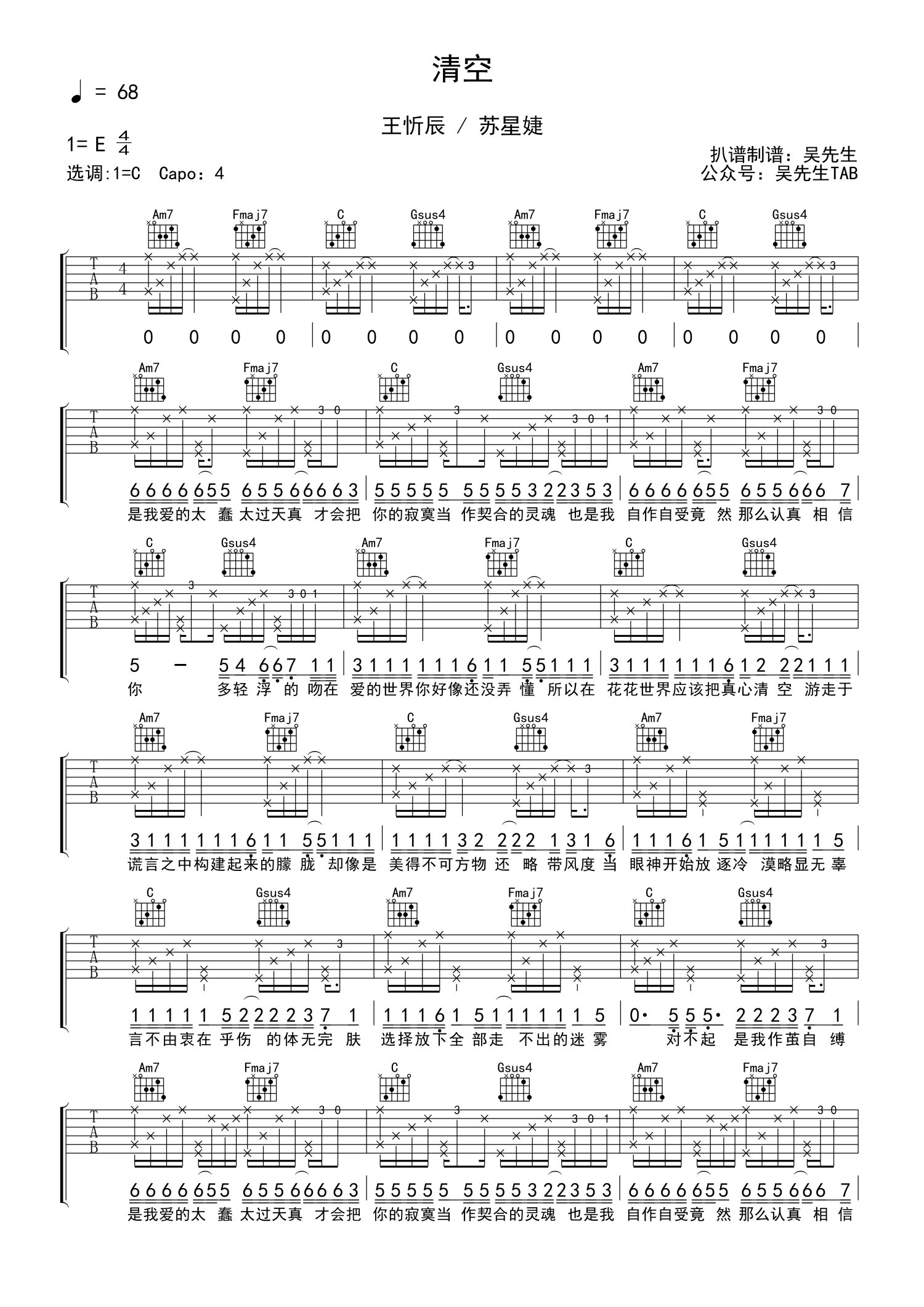 曲谱介绍: 王忻辰/苏星婕《清空》吉他谱_C调吉他弹唱谱