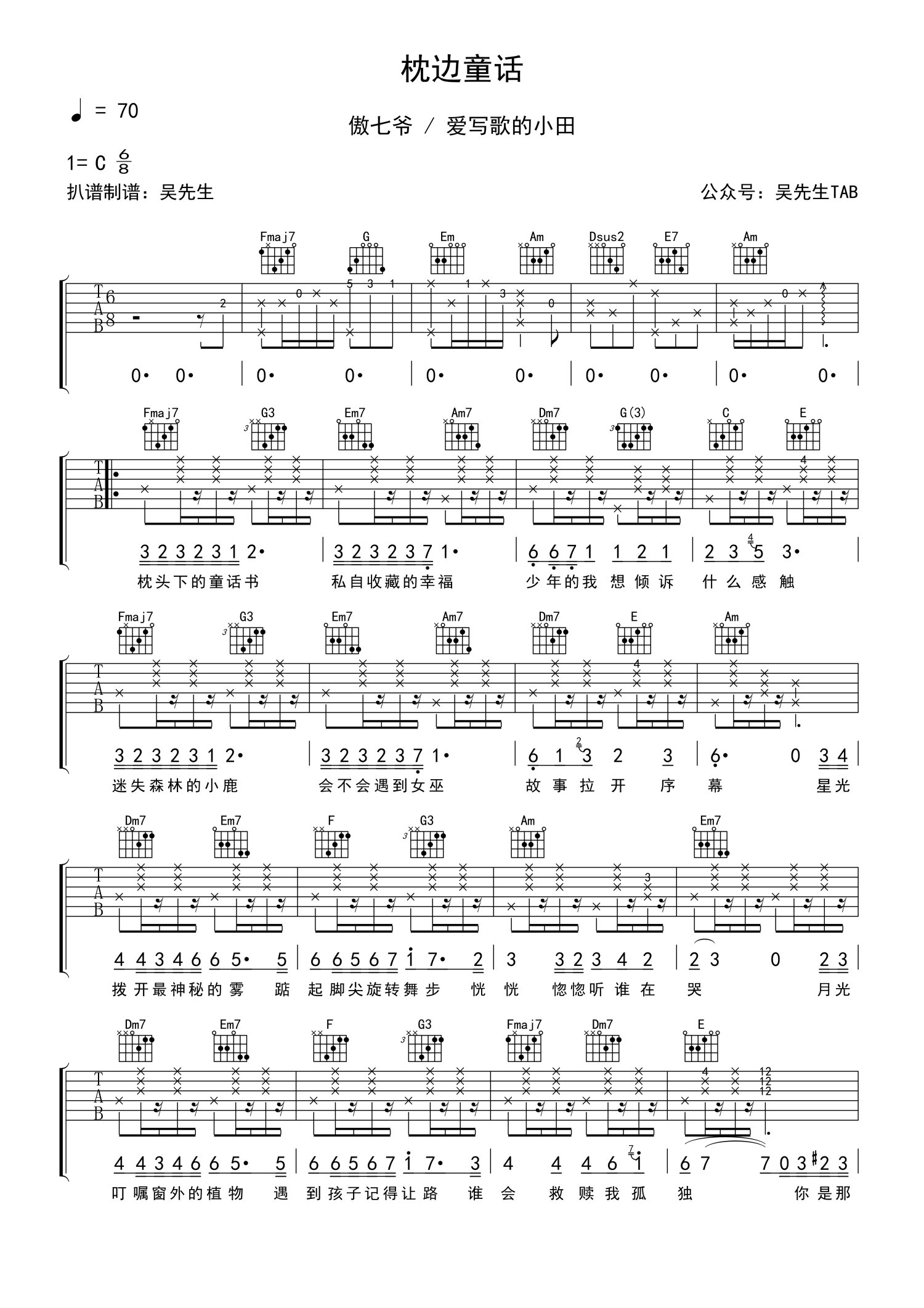 曲谱介绍: 傲七爷 / 爱写歌的小田《枕边童话》吉他谱_C调吉他弹唱谱
