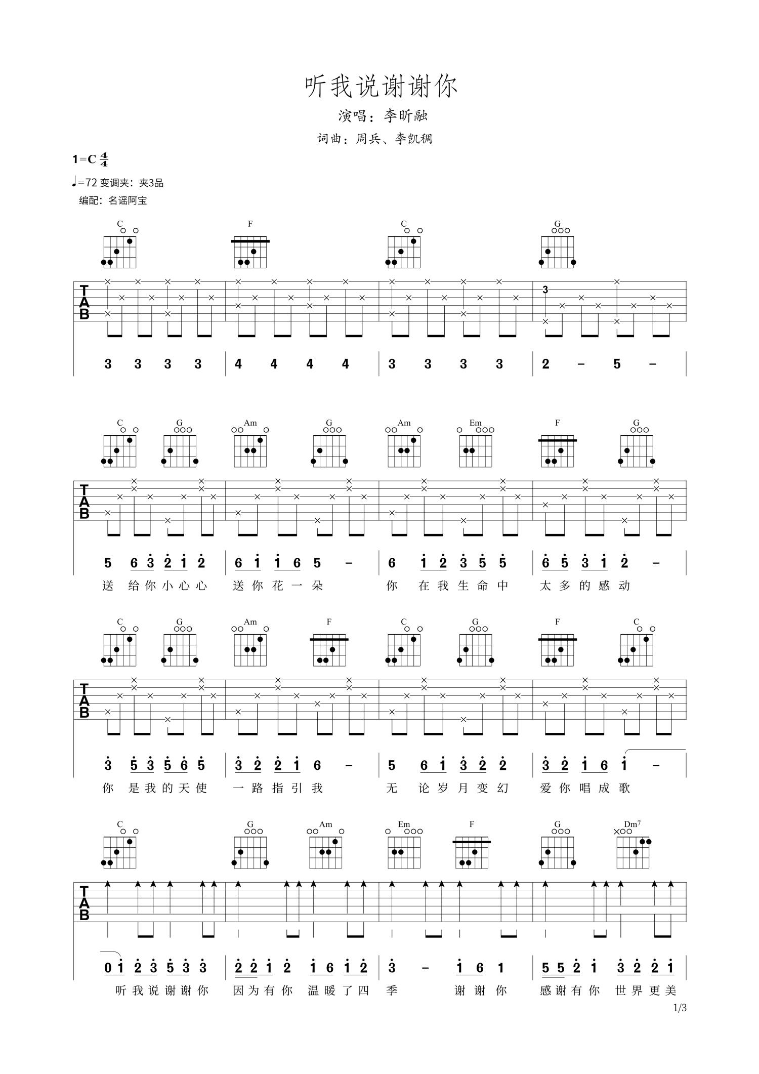 • 听我说谢谢你吉他谱 - 李昕融 - 吉他弹唱谱第1张