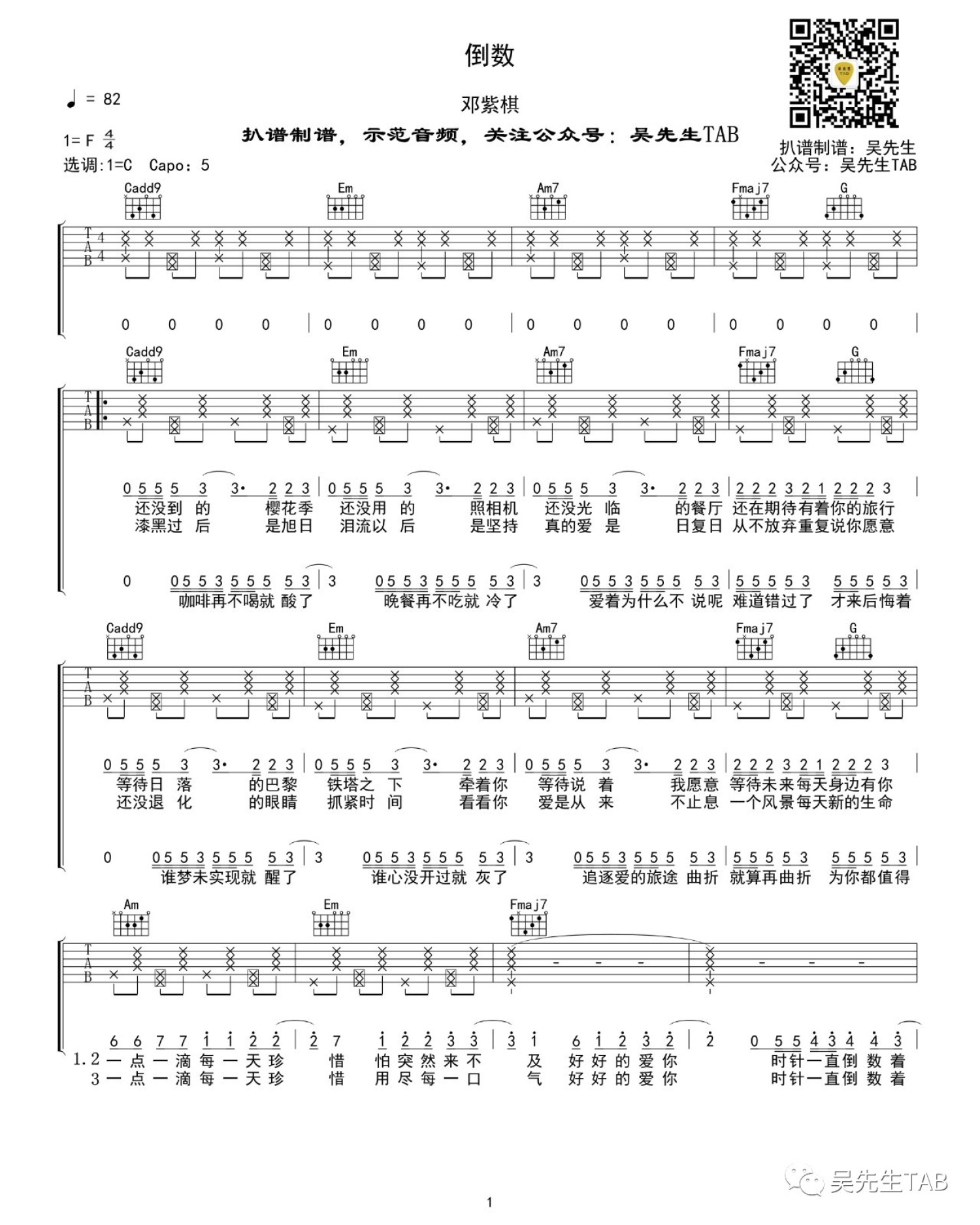 曲谱介绍: 邓紫棋《倒数》,人生在倒数的过程中,在有限的时间里有无限种可能,邓紫棋借该曲表达着自己灿烂直接的爱情观,鼓励心中藏爱的人要勇敢去表达。来自吴先生编配《倒数》吉他谱分享,C调和弦指法六线谱,变调夹夹第五品即为原调F调。主歌分解节奏型,方框表示拍弦,扫弦的节奏也是重复循环,只要Am和弦转F横按能流畅就问题不大。