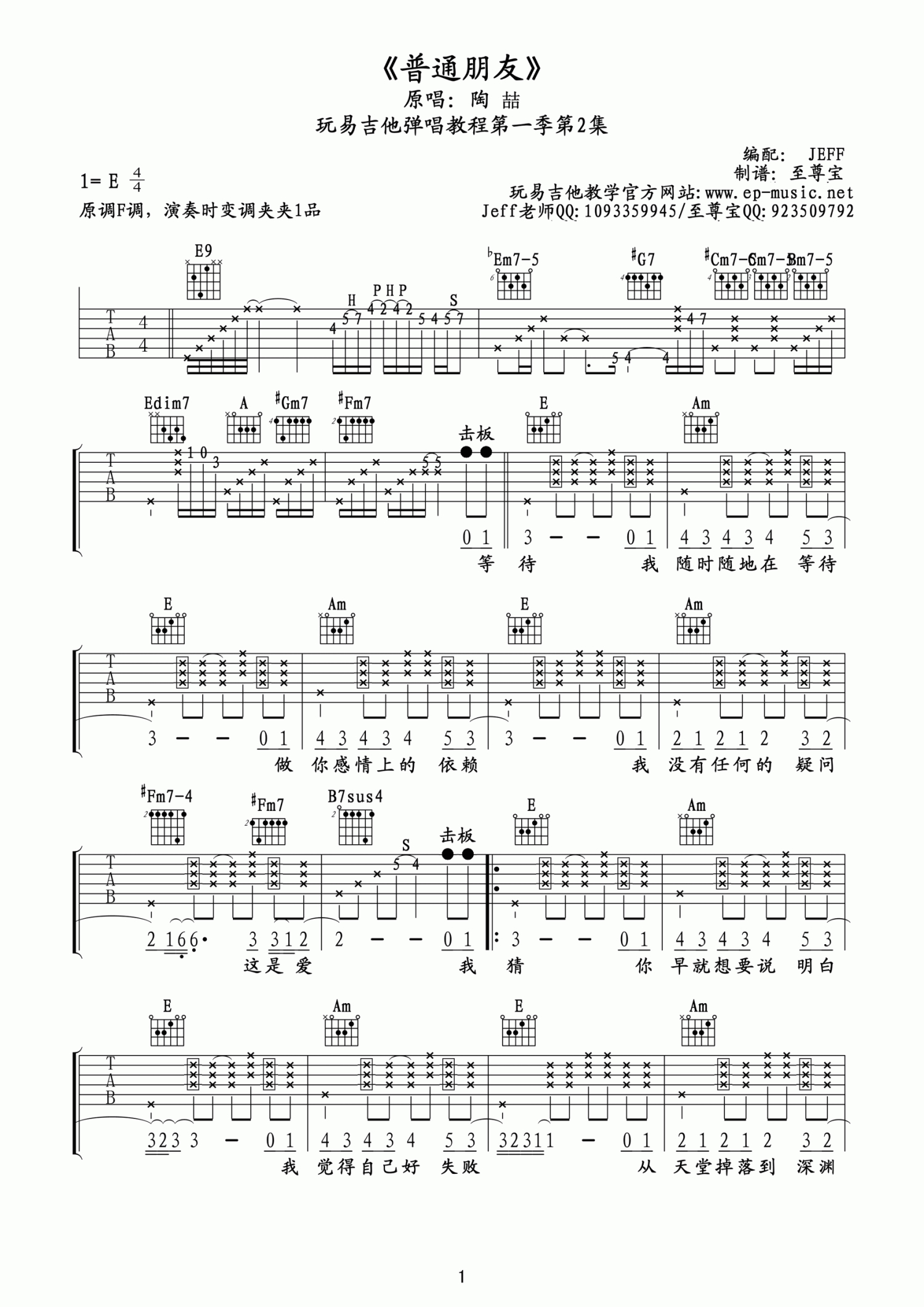 普通朋友吉他谱 - 陶喆 - E调吉他弹唱谱