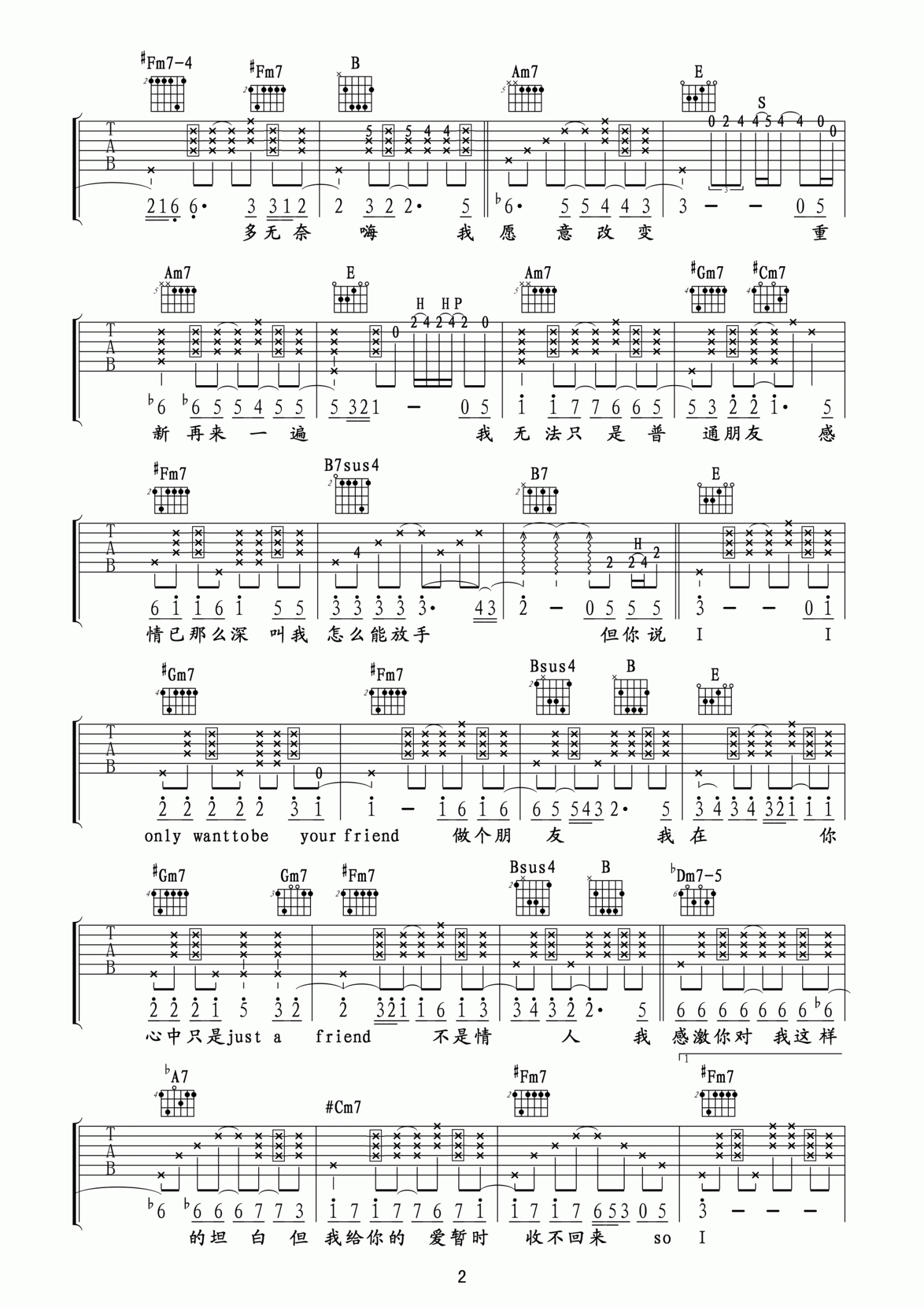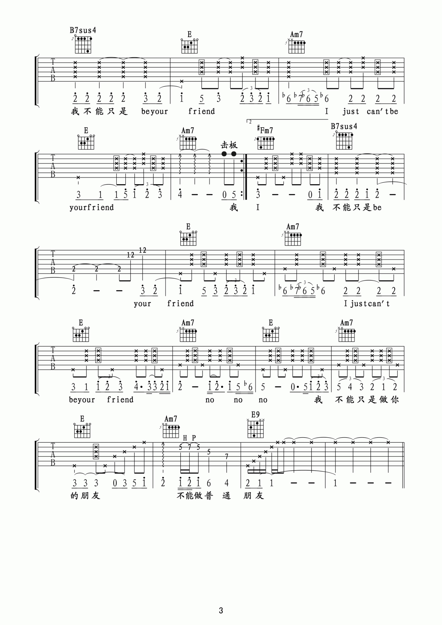 曲谱介绍: “等待,我随时随地在等待,做你感情上的依赖……”陶喆经典R&B风格作品《普通朋友》,这首歌的前奏是很多吉他爱好者必练的曲目。多少人以朋友的名义爱护着一个人,在TA看不到的地方,默默守护却从不打搅,心里惦记却从不幻想拥有。普通朋友吉他弹唱视频教程来自玩易吉他编配《普通朋友》吉他谱,E调指法版。大量的连音运用还有弹唱部分的击勾弦技巧和拍弦技巧赋予了歌曲很强的律动感,和弦比较难有些换和弦的频率也比较快,难度很大,适合已经进阶的琴友。