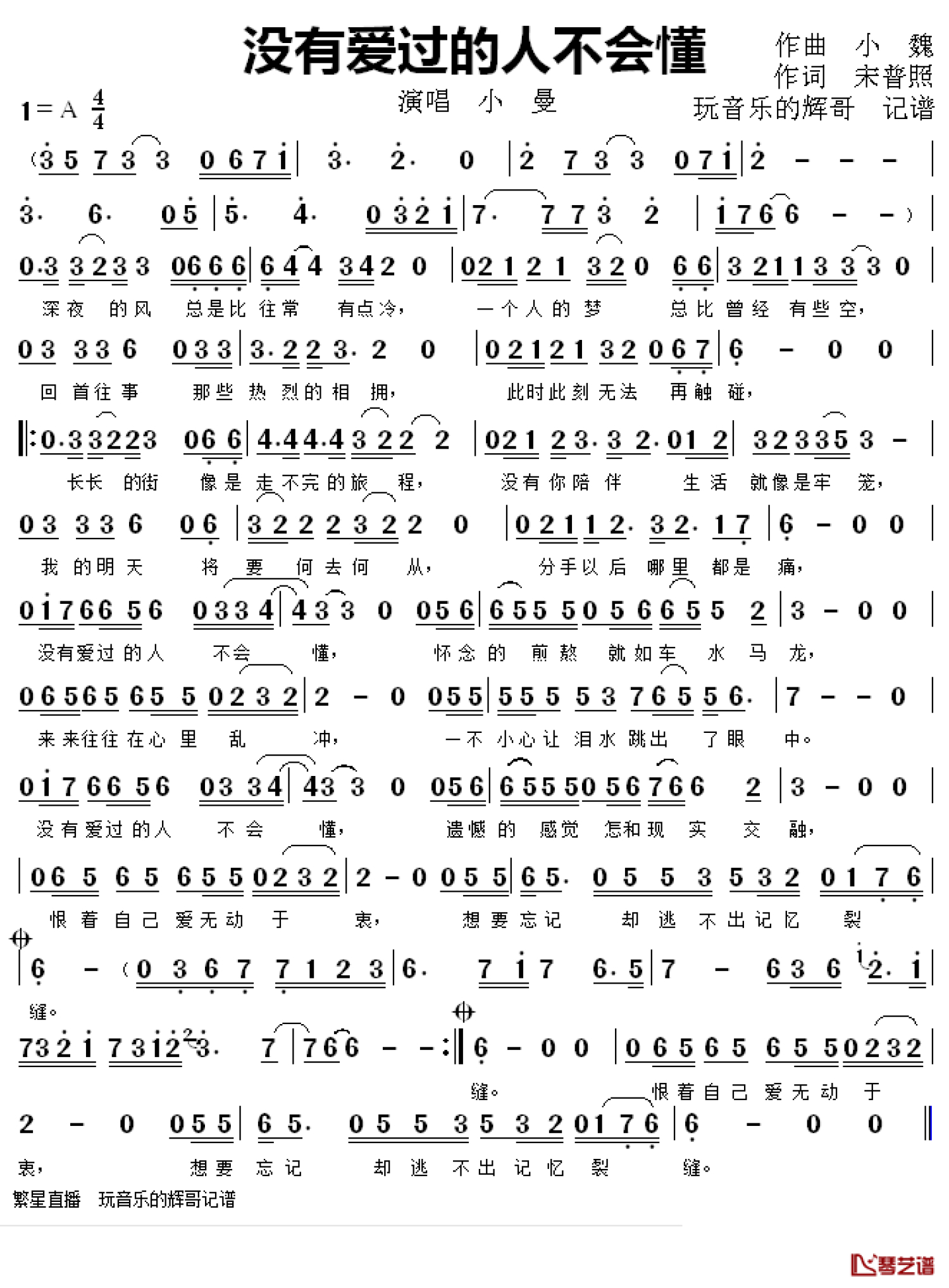 曲谱介绍: 没有爱过的人不会懂简谱歌词 词:宋普照 曲:小魏 录音:壹歌传媒录音棚 录音师:易欣 制作人:陈伟 出品:浙江壹歌文化传媒有限公司 深夜的风总是比往常有点冷 一个人的梦总比曾经有些空 回首往事那些热烈的相拥 此时此刻无法再触碰 长长的街像是走不完的旅程 没有你陪伴生活就像是牢笼 我的明天将要何去何从 分手以后哪里都是痛 没有爱过的人不会懂 怀念的煎熬就如车水马龙 来来往往在心里乱冲 一不小心让泪水跳出了眼中 没有爱过的人不会懂 遗憾的感觉怎和现实交融 恨着自己爱无动于衷 想要忘记却逃不出记忆裂缝 长长的街像是走不完的旅程 没有你陪伴生活就像是牢笼 我的明天将要何去何从 分手以后哪里都是痛 没有爱过的人不会懂 怀念的煎熬就如车水马龙 来来往往在心里乱冲 一不小心让泪水跳出了眼中 没有爱过的人不会懂 遗憾的感觉怎和现实交融 恨着自己爱无动于衷 想要忘记却逃不出记忆裂缝 恨着自己爱无动于衷 想要忘记却逃不出记忆裂缝