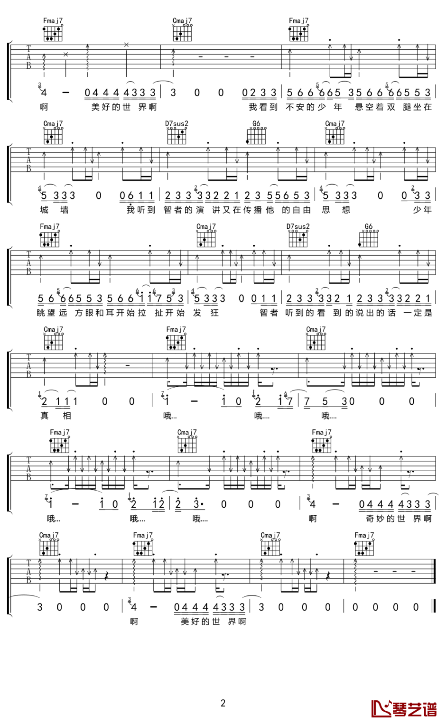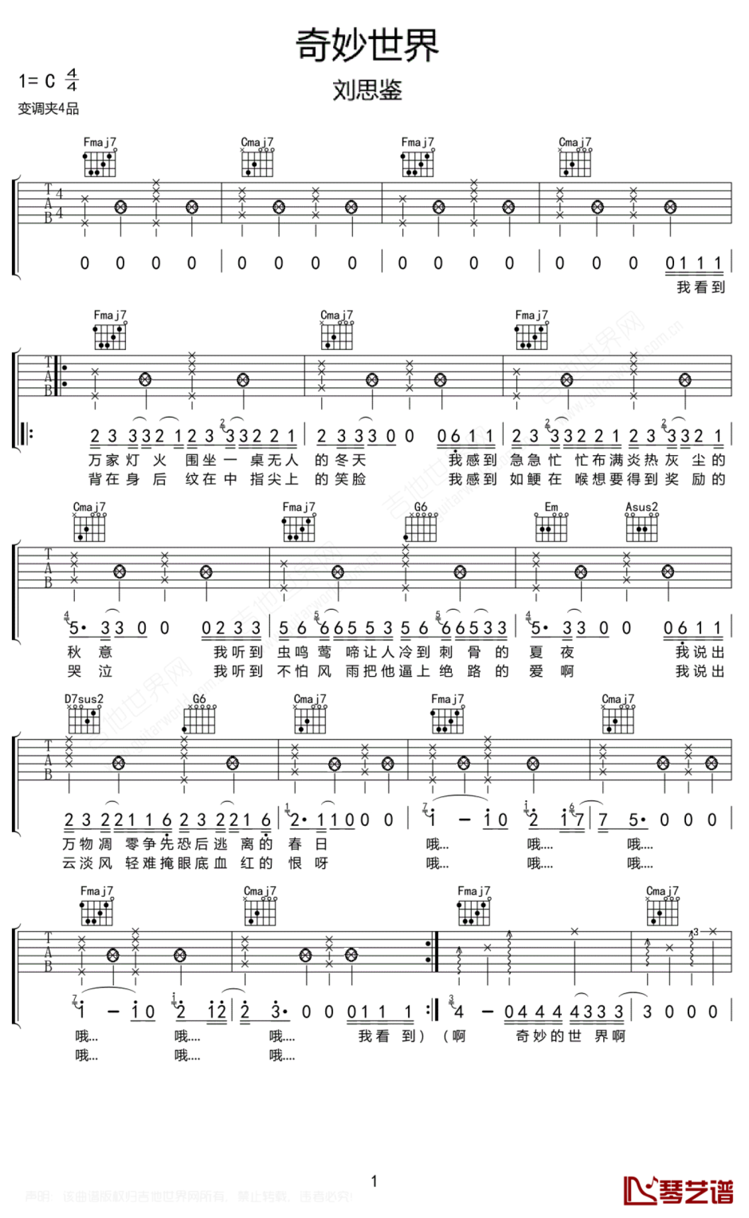 曲谱介绍:   《奇妙世界》吉他谱,刘思鉴,C调弹唱六线谱,变调夹夹4品,高清图片谱分享。 《奇妙世界》是由刘思鉴作词、作曲并演唱的歌曲,我看到万家灯火,围坐一桌无人的冬天,我感到急急忙忙,布满炎热灰尘的秋意,我听到虫鸣莺啼,让人冷到刺骨的夏夜,我说出万物凋零,争先恐后逃离的春日,我看到背在身后,纹在中指尖上的笑脸,我感到如鲠在喉,想要得到奖励的哭泣。