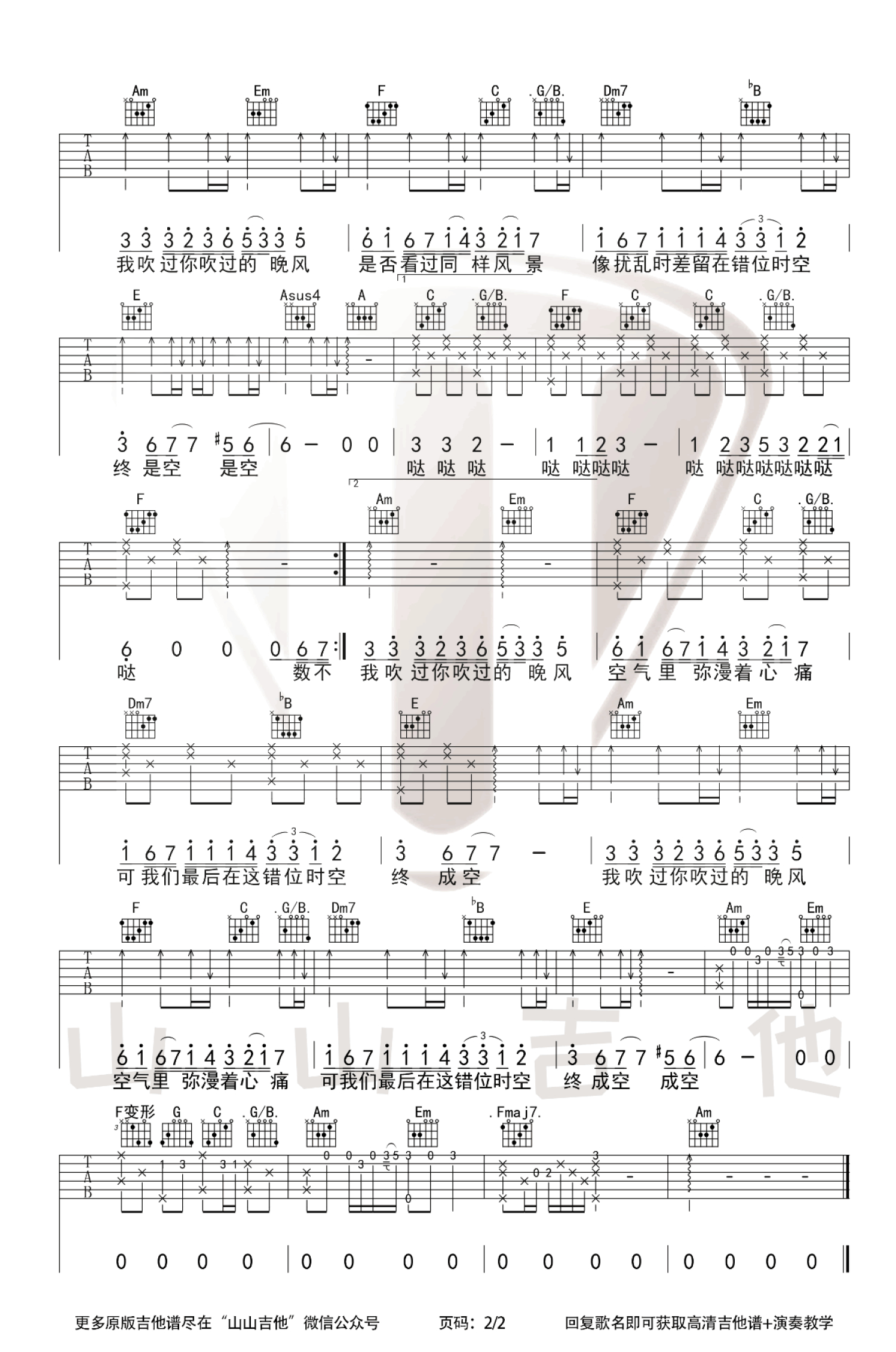 曲谱介绍: 错位时空吉他谱,艾辰演唱,最近在网络各大音乐平台大热的歌曲。错位时空六线谱,选用C调指法编配,Capo夹三品,我吹过你吹过的晚风,那我们算不算相拥,这或许就是错位时空的意义吧。如果你有一个距离很近但无法拥抱的人,你会尝试去做他做过的事,去他去过的地方,试图寻找他的气息。