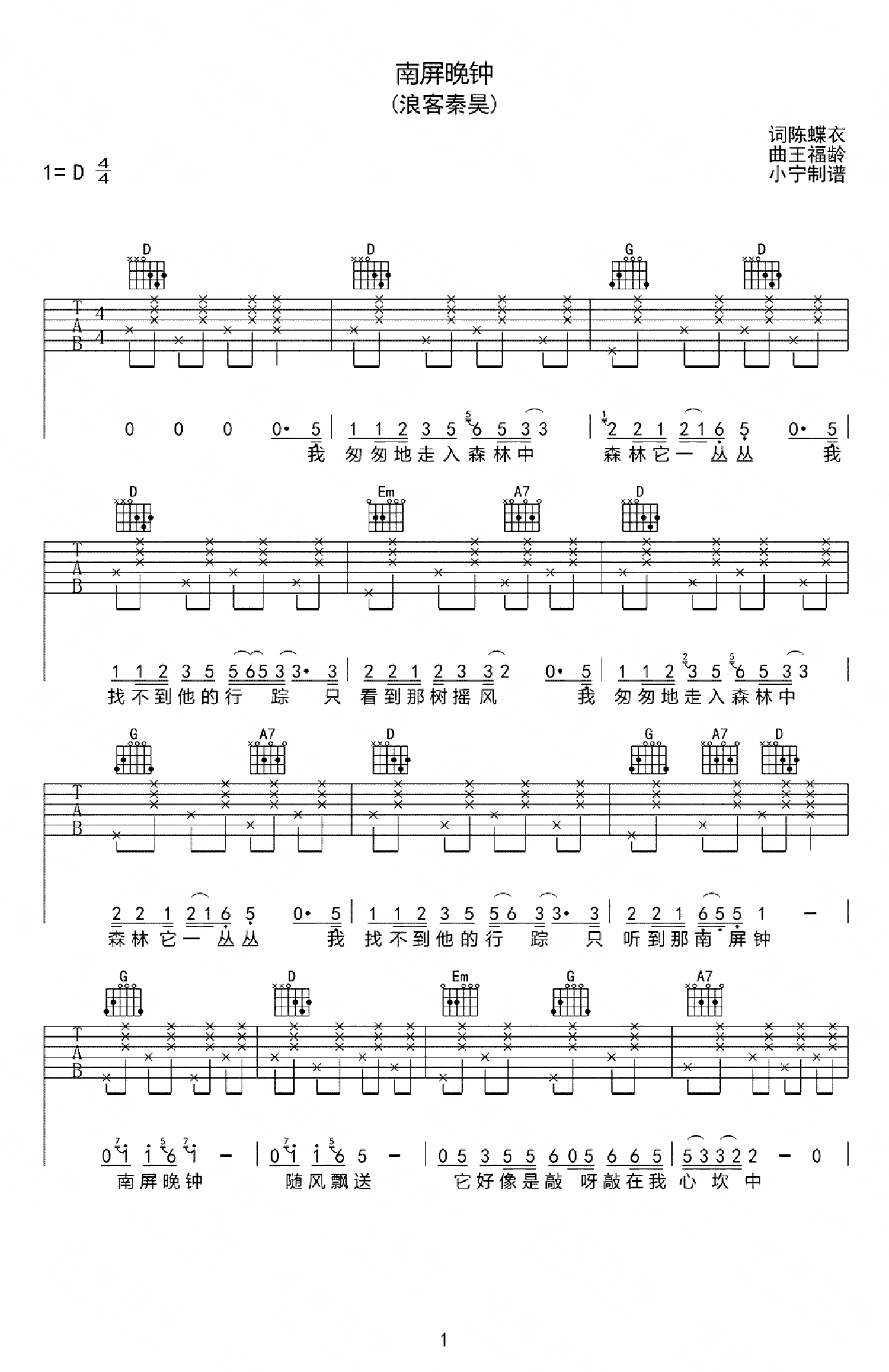 南屏晚钟吉他谱 - 浪客秦昊 - D调吉他弹唱谱