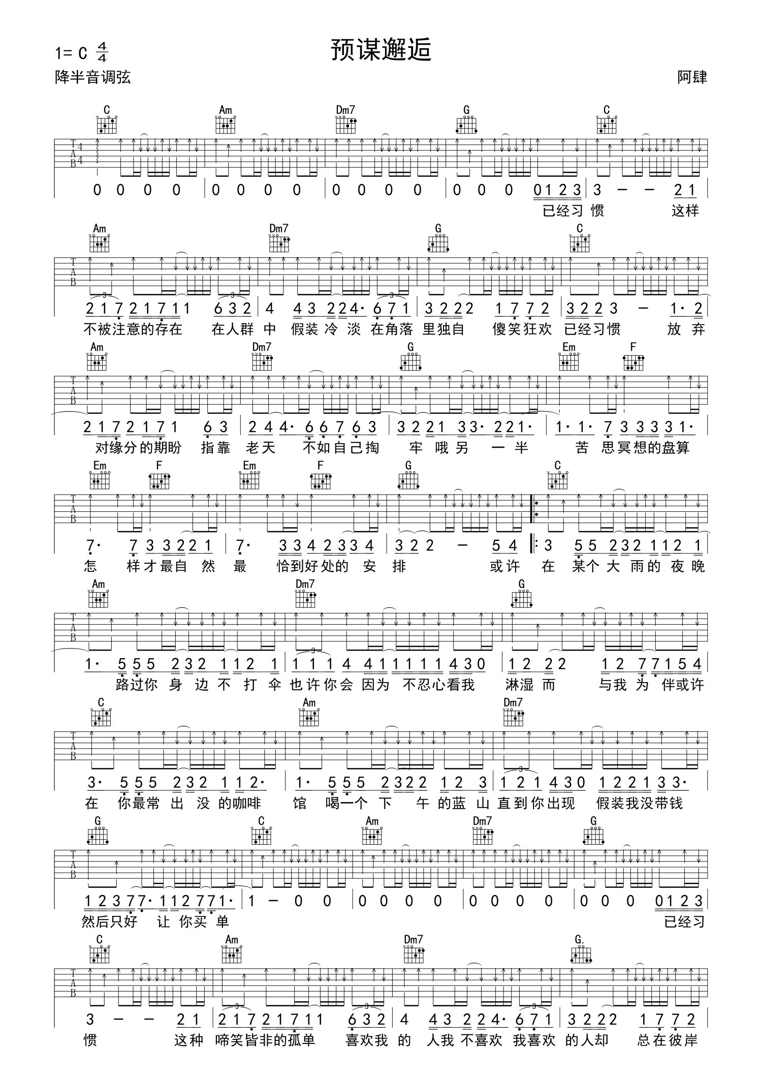 • 预谋邂逅吉他谱 - 阿肆 - C调吉他弹唱谱第1张