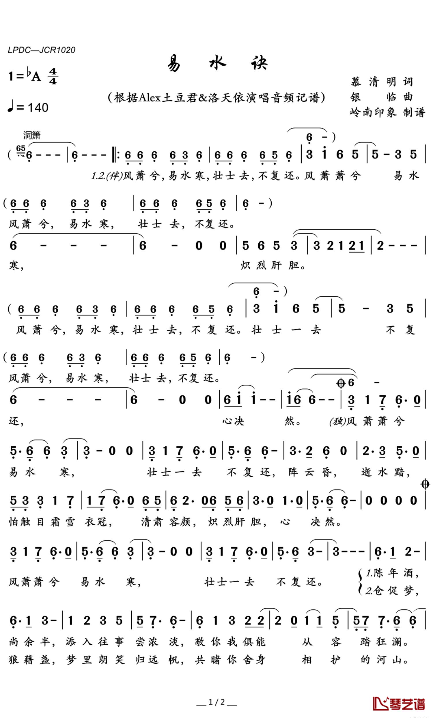 易水诀简谱 - Alex土豆君/天依