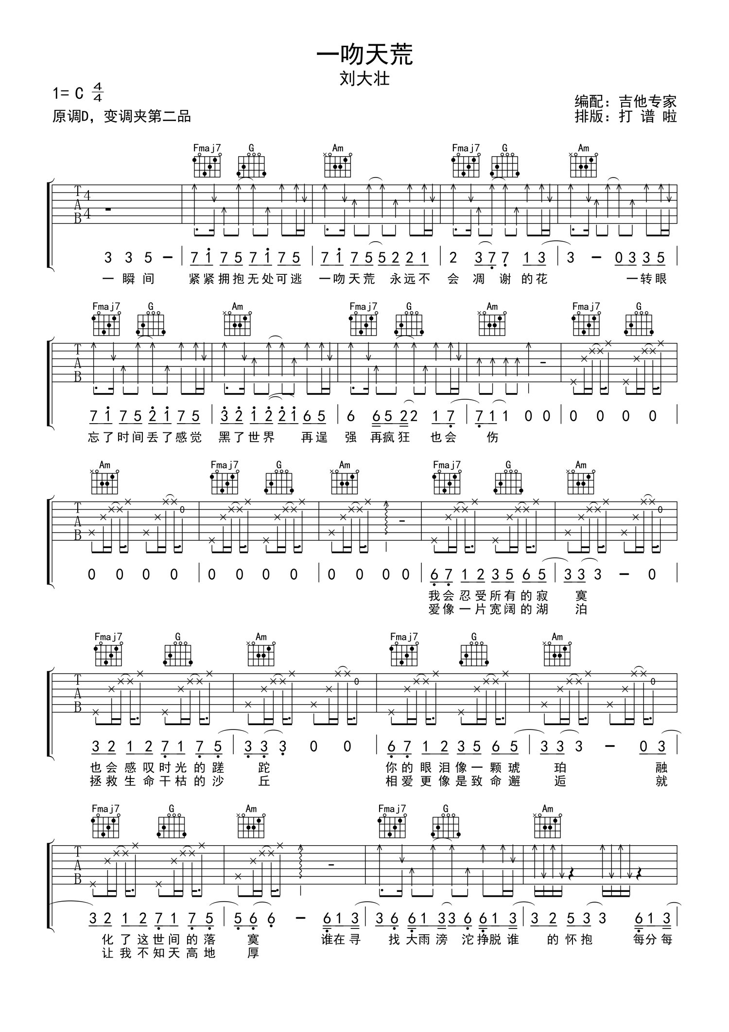 曲谱介绍: 刘大壮《一吻天荒》吉他谱_C调吉他弹唱谱
