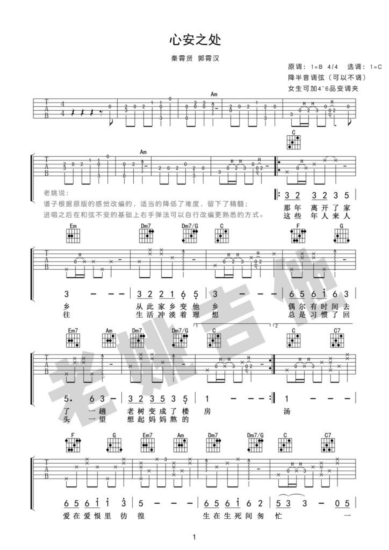 曲谱介绍: 秦霄贤/郭霄汉《心安之处》吉他谱_C调吉他弹唱谱