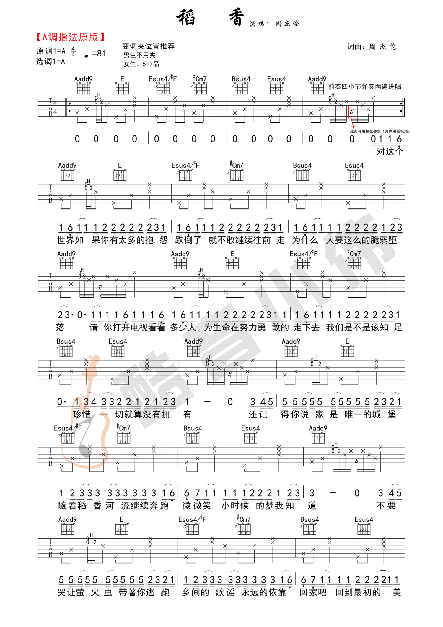 曲谱介绍: 周杰伦《稻香》吉他谱_A调吉他弹唱谱_原版