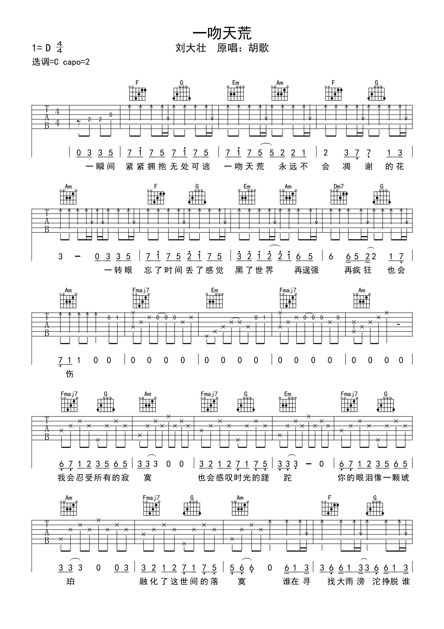 一吻天荒吉他谱 - 刘大壮 - C调吉他弹唱谱