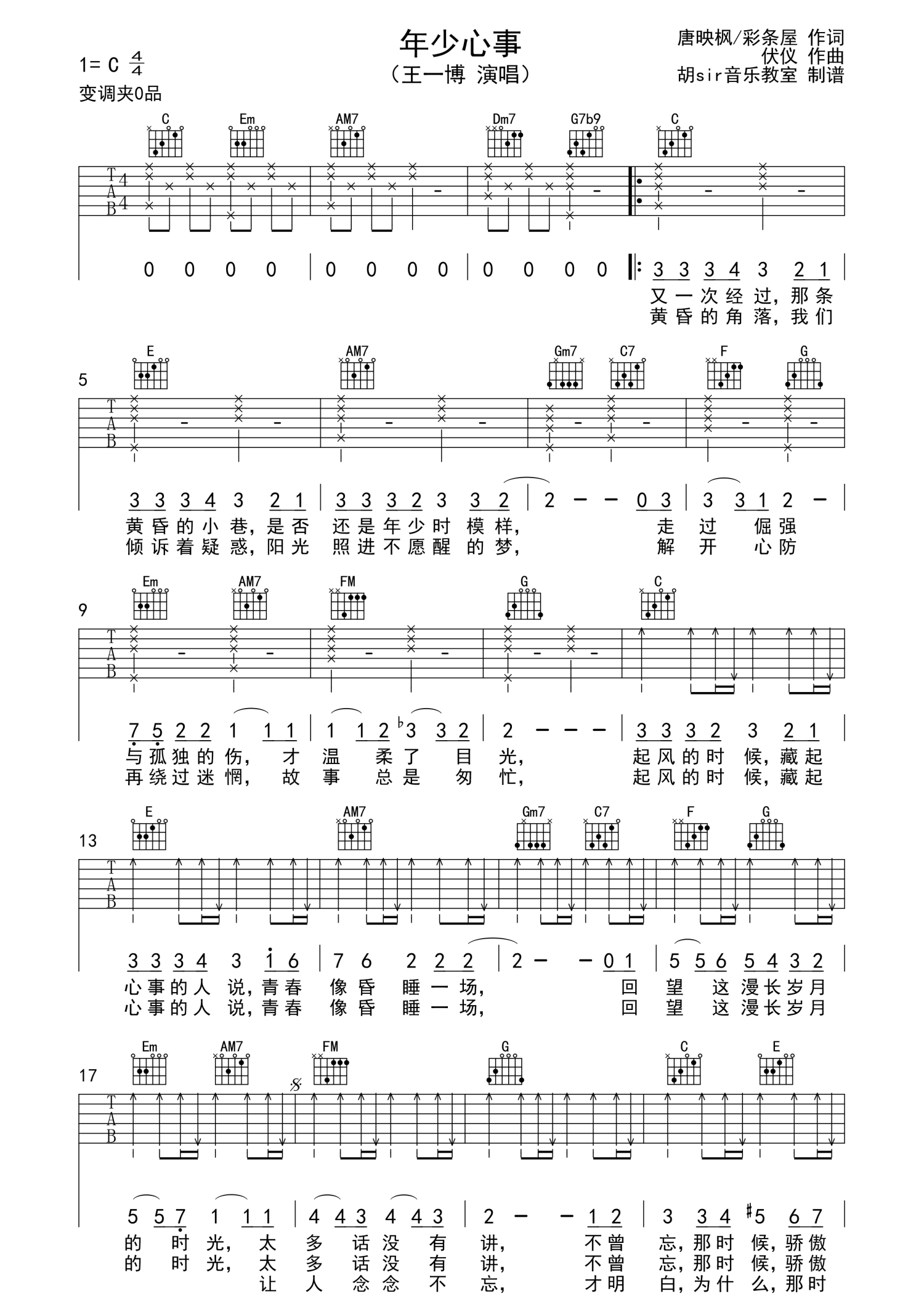 • 年少心事吉他谱 - 王一博 - C调吉他弹唱谱第1张