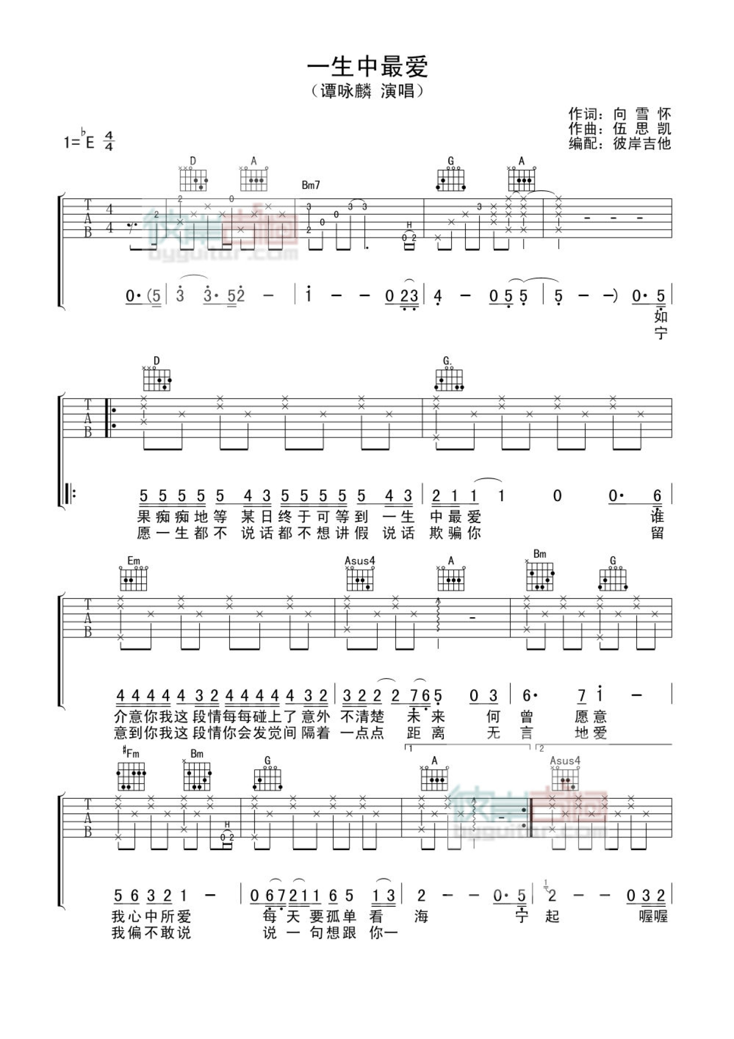 曲谱介绍: 谭咏麟《一生中最爱》吉他谱_D调吉他弹唱谱