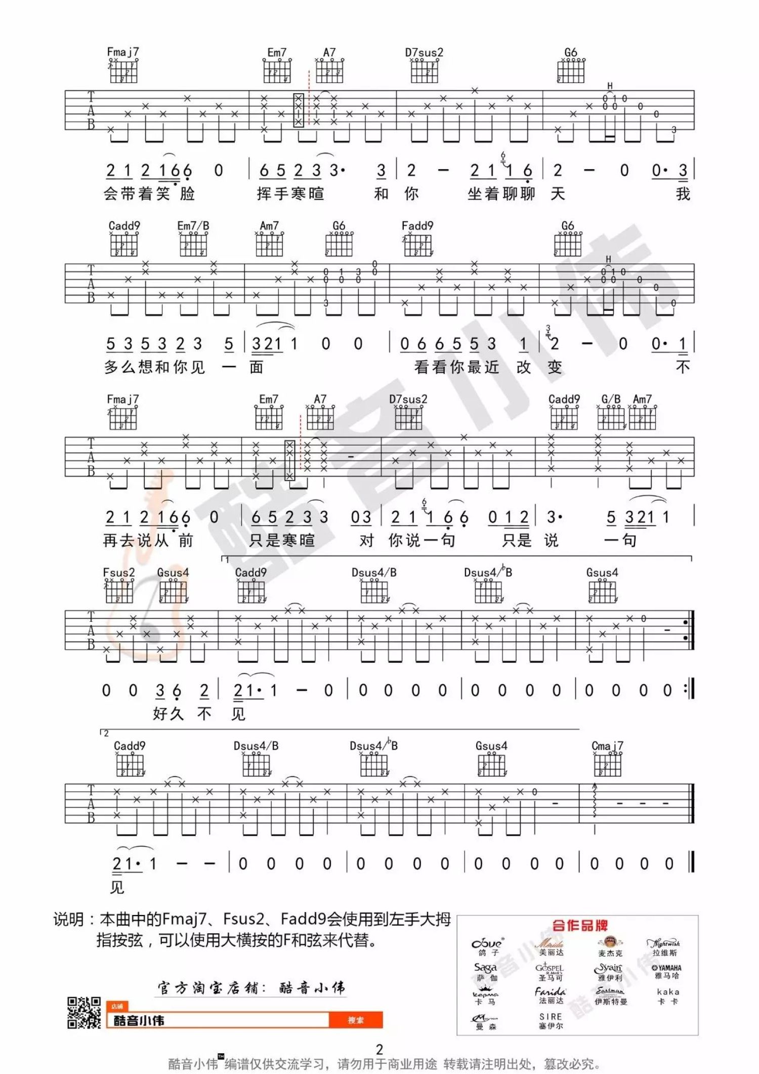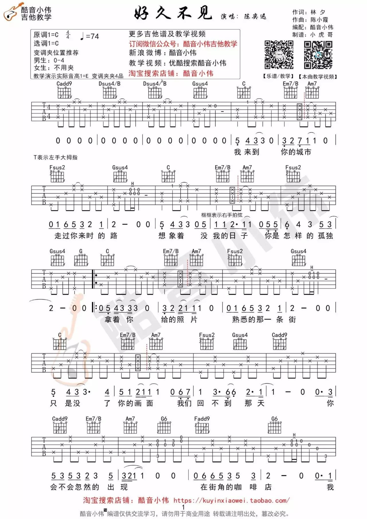曲谱介绍: 我多么想和你见一面,看看你最近改变,不再去说从前,只是寒暄,对你说一句,只是说一句,好久不见。在繁华的闹市,或灯火通明的夜巷,或偶遇背影,或擦肩而过。曾经那个熟悉的人,四目相对,彼此微笑,一句“好久不见”,莫名心头一暖,鼻子发酸。陈奕迅《好久不见》吉他谱分享,来自酷音小伟编配《好久不见》C调吉他谱,中级版&简单版。小伟老师重新编配了一下指法,和原曲有些不一样,弹唱男生变调夹夹第四品,女生可以不夹变调夹。因为歌曲的演唱音高较低沉,大家可以合理使用变调夹,节拍器速度大概每分钟74拍。视频里小伟老师的反复段落为即兴弹奏,大家可以参照曲谱的反复段落弹唱,本曲中的Fmaj7、Fsus2、Fadd9和弦会使用到左手大拇指按弦,不熟悉的可以使用大横按的F和弦来代替。