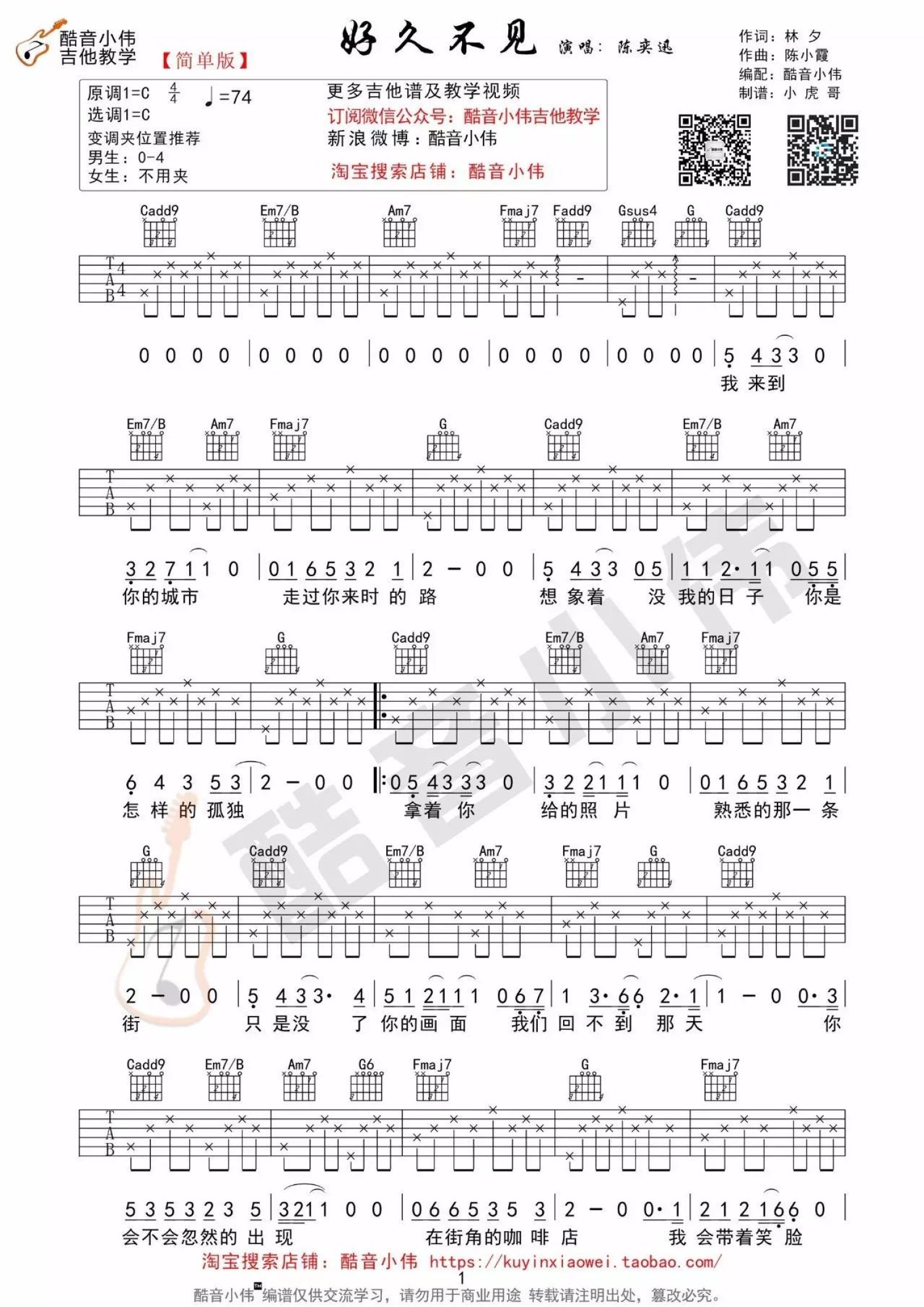 曲谱介绍: 陈奕迅《好久不见》吉他谱_C调吉他弹唱谱_简单版