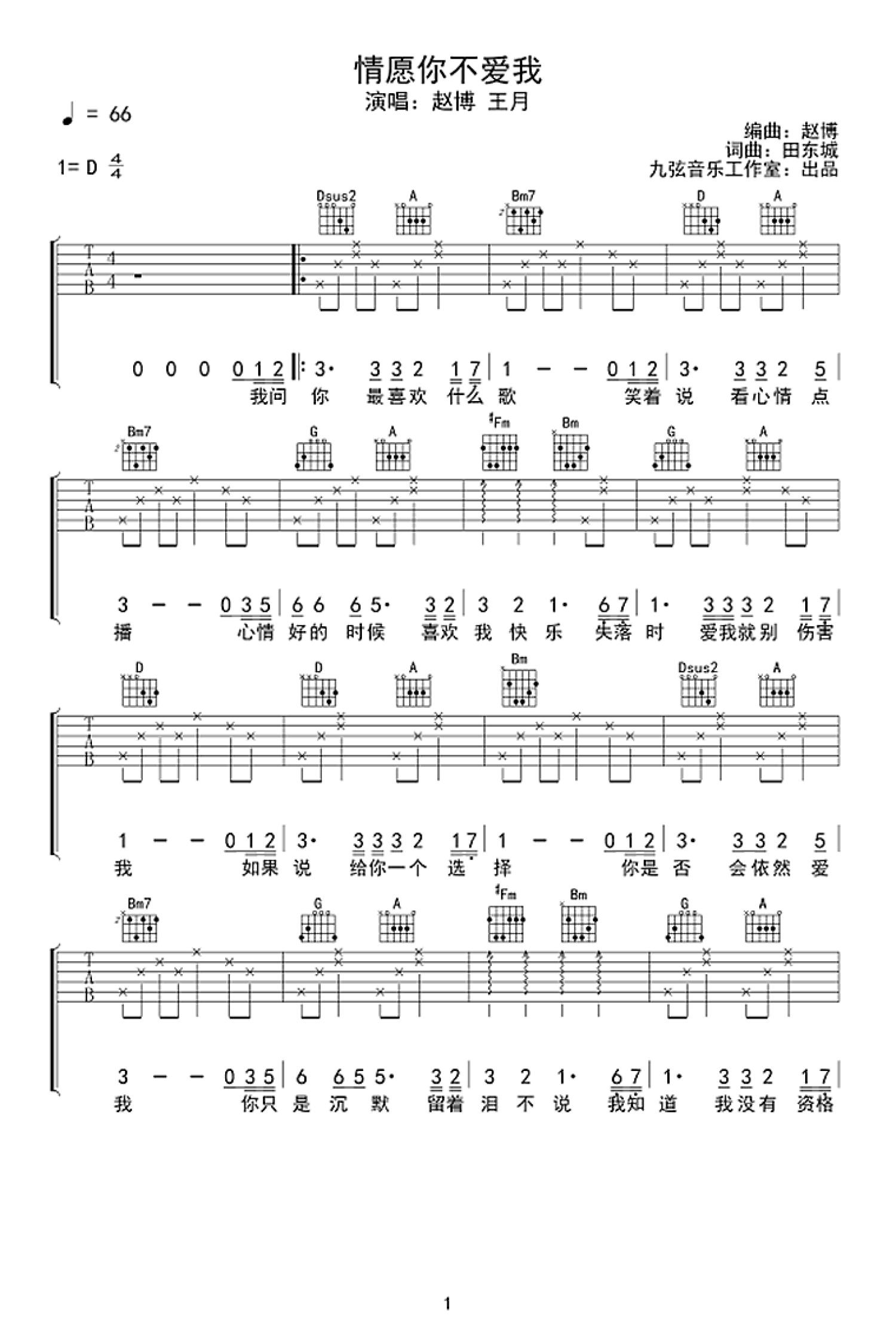 曲谱介绍: 情愿你不爱我吉他谱,时间胶囊乐队赵博王月演唱,一首原创情歌,原创力量乐队的原创作品,我问你最喜欢什么歌,你笑着说,看心情点播,心情好的时候,你喜欢我快乐,失落时爱我就别伤害我,如果说给你一个选择,你是否会依然爱我,你只是沉默,流着泪不说,我知道我没有资格说