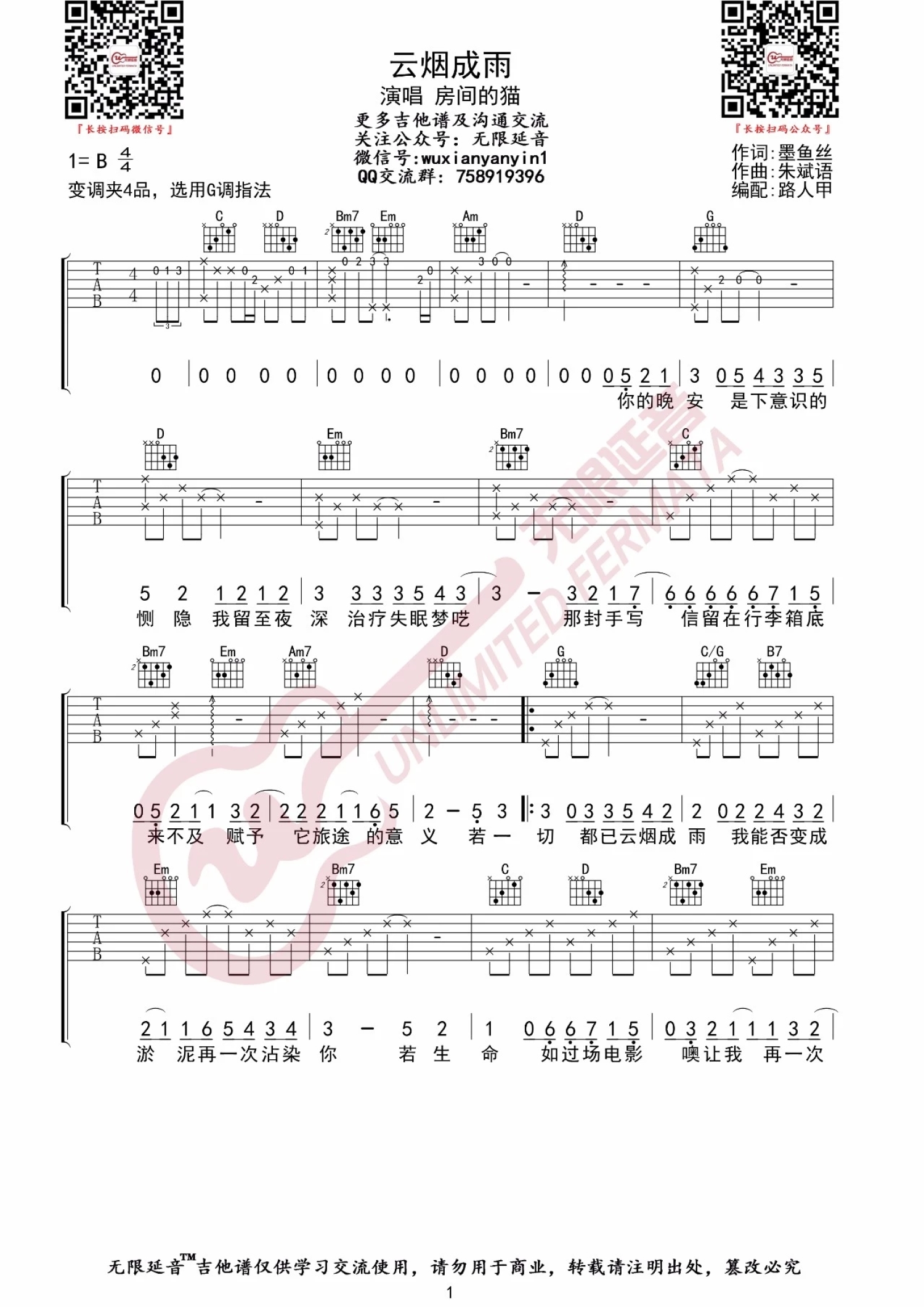 曲谱介绍: 房东的猫《云烟成雨》吉他谱_G调吉他弹唱谱