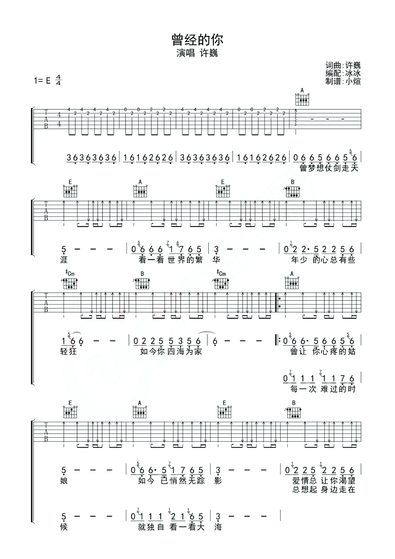 曾经的你吉他谱 - 许巍 - E调吉他弹唱谱