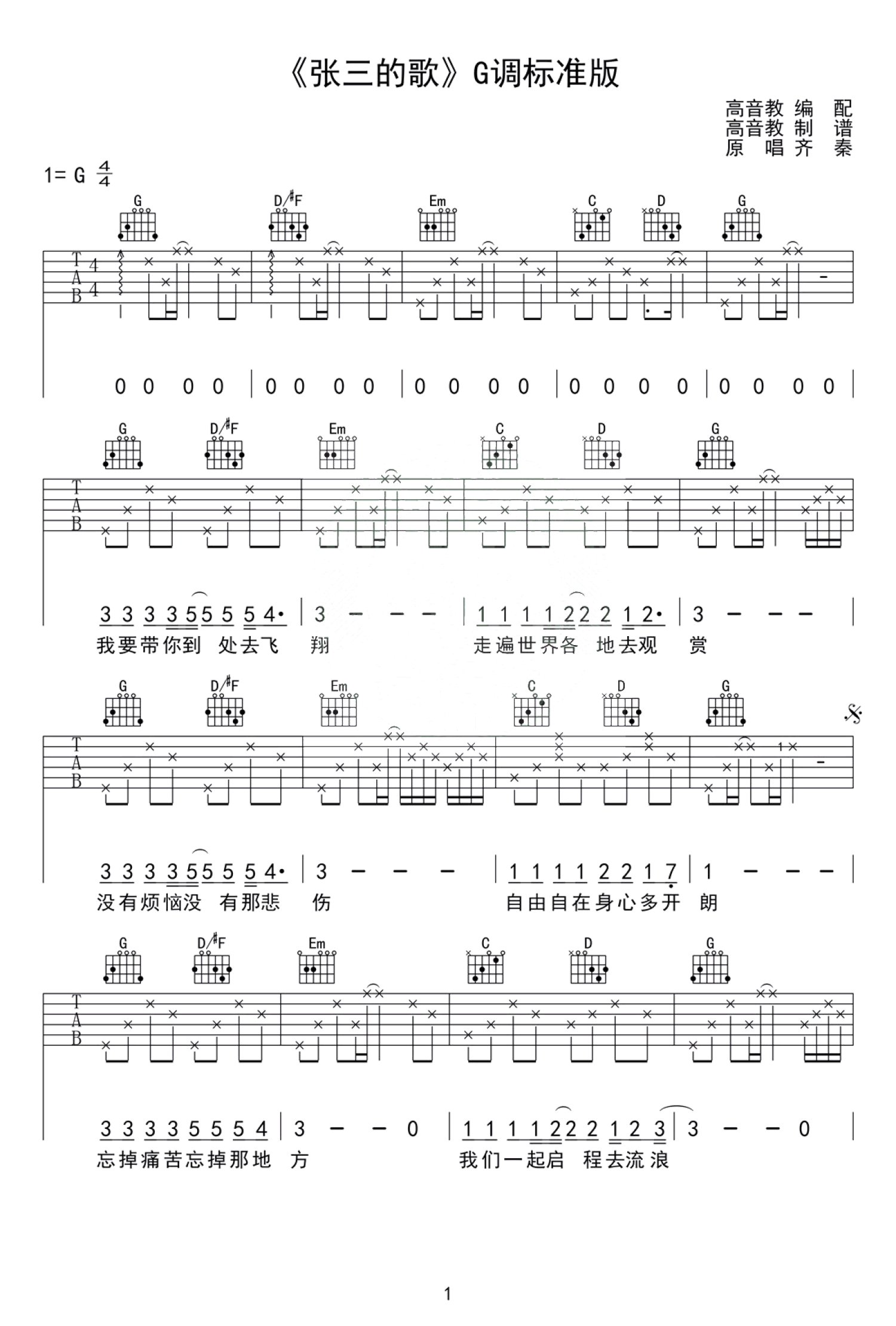 张三的歌吉他谱 - 齐秦 - G调吉他弹唱谱