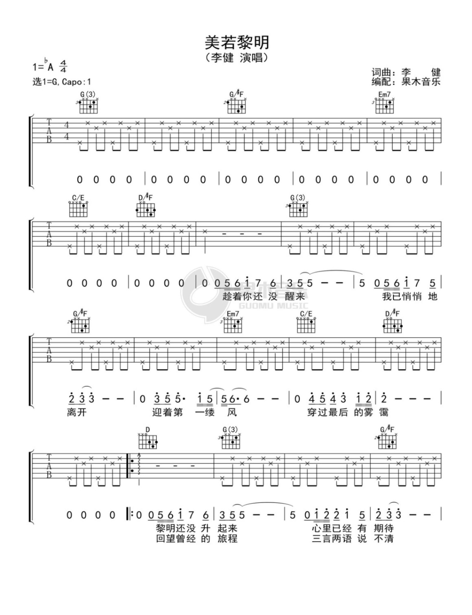 曲谱介绍: 李健《美若黎明》吉他谱_G调吉他弹唱谱