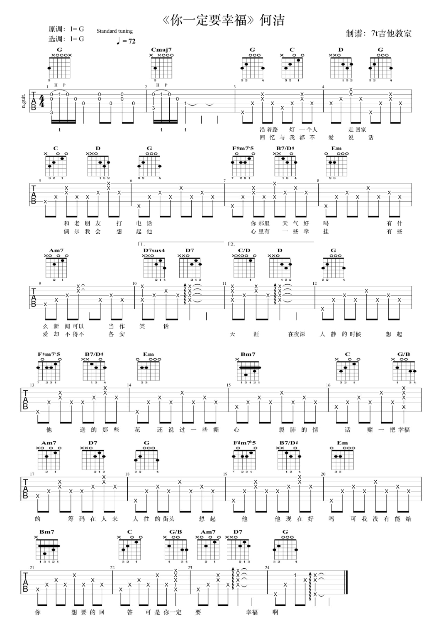 曲谱介绍: 何洁《你一定要幸福》吉他谱,G调指法,这首歌的原调是G大调,用的也是G大调来编配谱子,整首歌的难度都不大,相信大家很快能学会哦!随谱附上吉他谱配套弹唱视频,琴友们跟随老师示范演示练习。