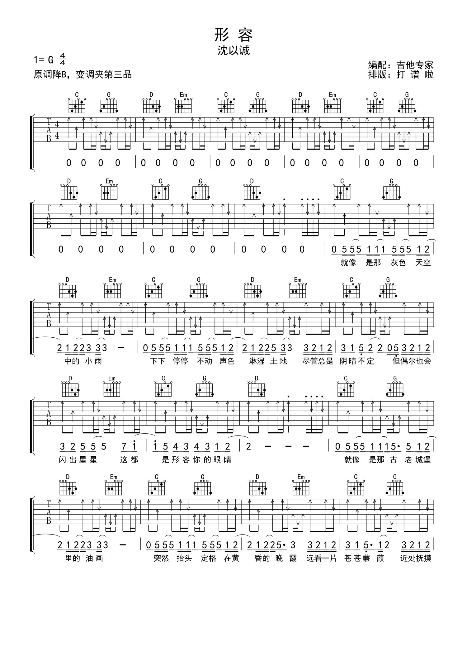 曲谱介绍: 沈以诚《形容》吉他谱_G调吉他弹唱谱