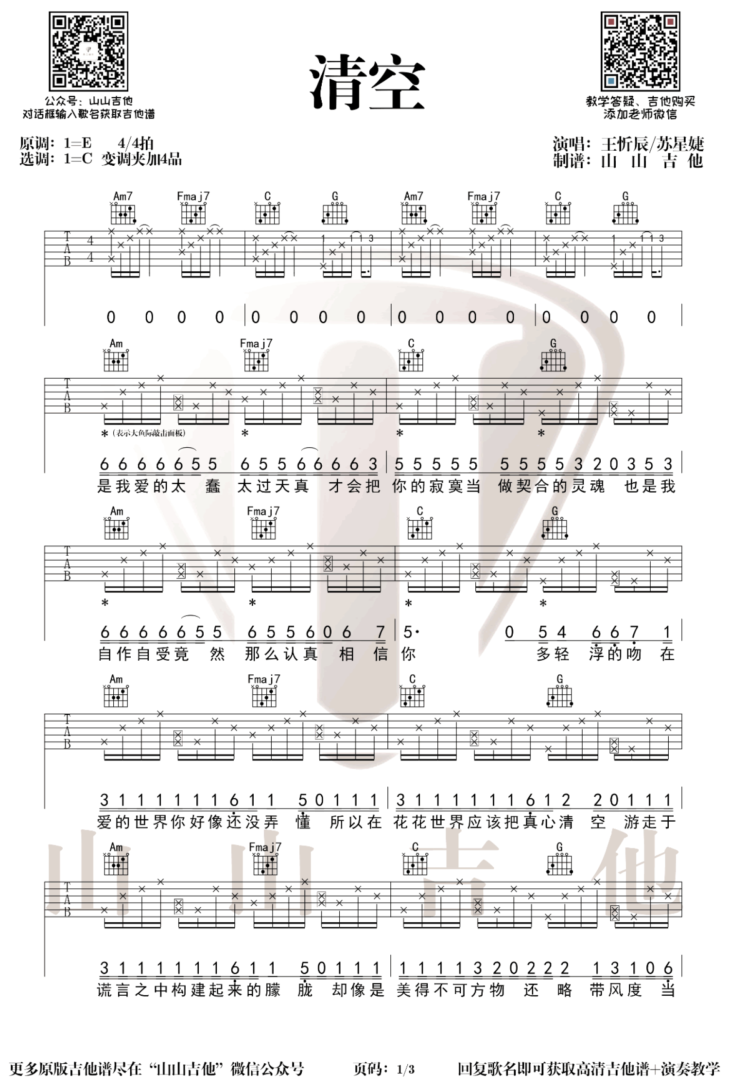 曲谱介绍: 原调E选调C,CAPO夹四品,结合歌曲的鼓点和节奏,制作了这张带打板和拍弦技巧的吉他谱,随谱附上《清空》吉他弹唱视频,琴友们喜欢这首歌可以参考演示练习起来。