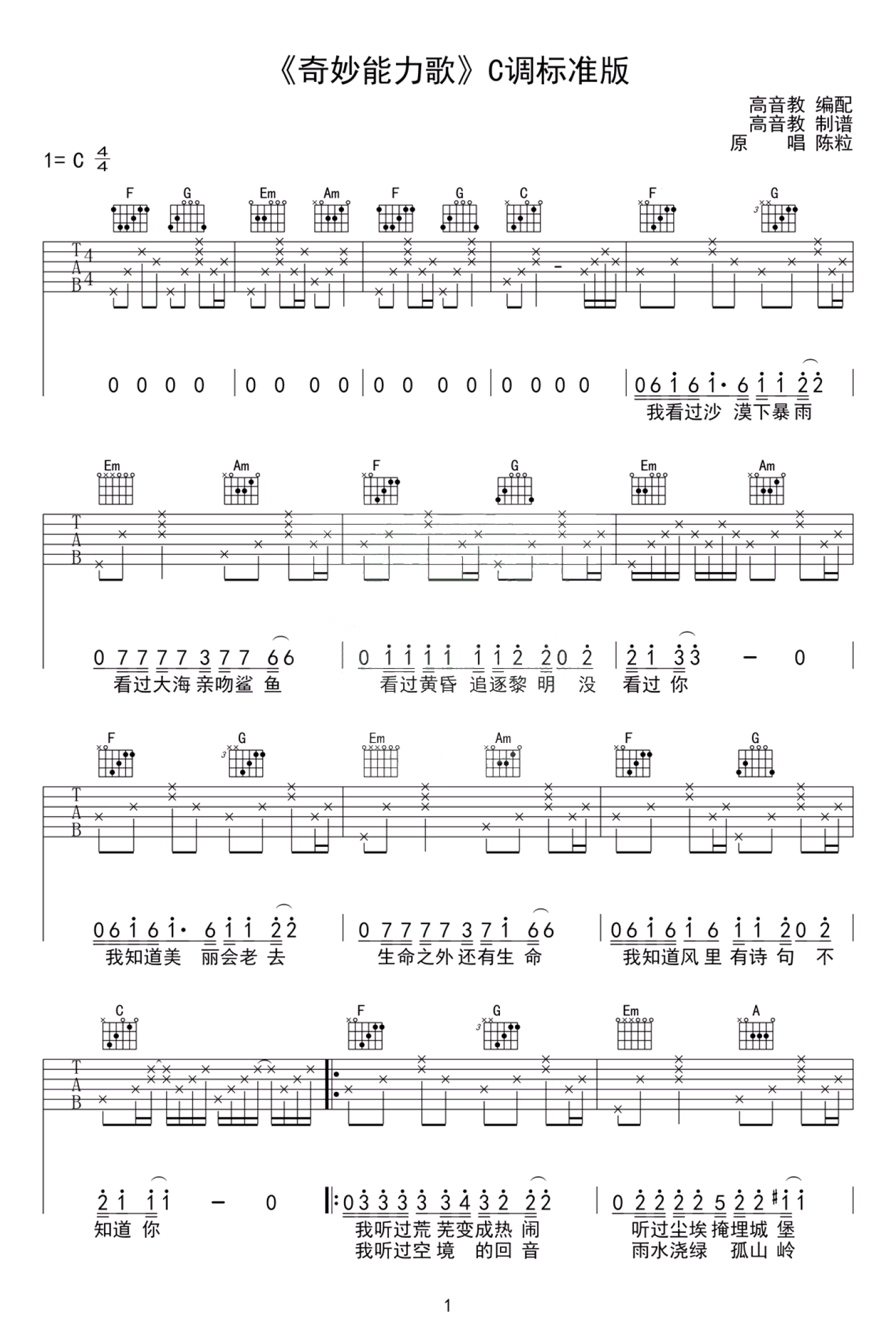 曲谱介绍: 奇妙能力歌吉他谱,陈粒演唱,C调标准版,一首好听的民谣歌曲,歌词营造的意境让人产生情感的共鸣,娓娓道来的歌声平淡质朴,仿佛一个少女在安静一隅回忆往事,如浅饮清酒一般越来越有风味。