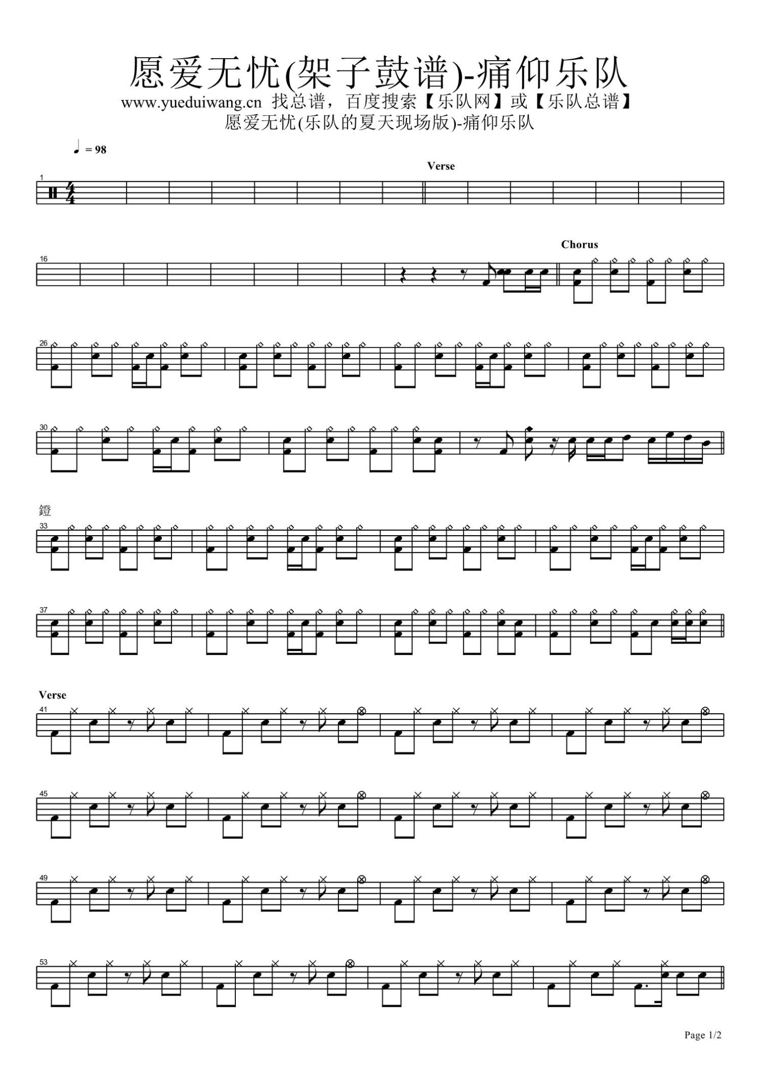 愿爱无忧鼓谱 - 痛仰乐队 - 架子鼓谱 - 乐队的夏天现场版