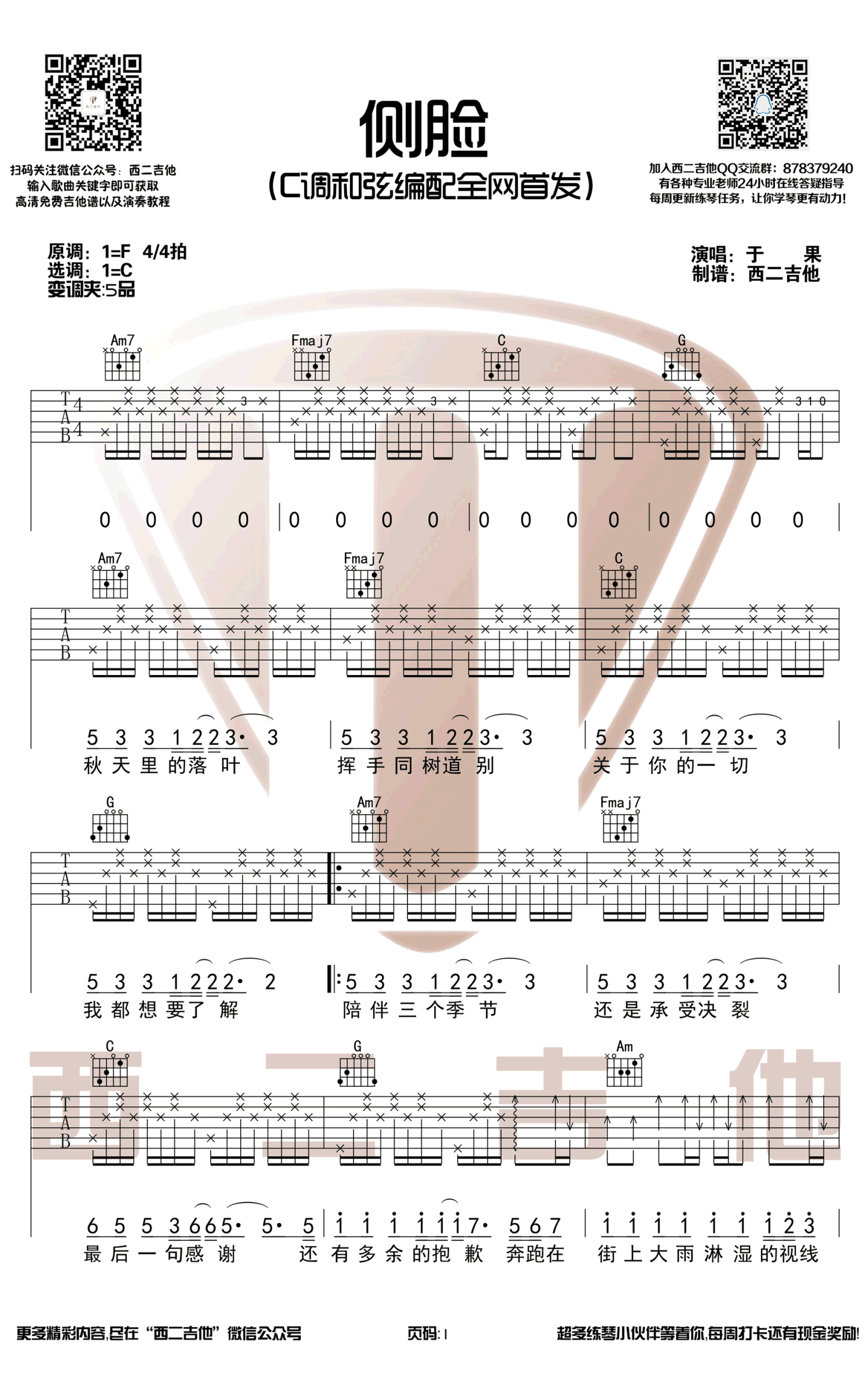 曲谱介绍: 侧脸吉他谱,于果一首在网络音乐平台受到欢迎的单曲,原调F,选用C调指法,变调夹夹第五品。爱上一个人,可以披荆斩棘义无反顾,可以生出与全世界对抗的勇气。然而,爱情不是靠付出努力就能收获圆满。离你而去的人,终究只不过剩下一张模糊的侧脸。磁性嗓音的情歌,唱出一个伤感的爱情故事,娓娓所说内心的苦楚,治愈你心灵的伤痕。