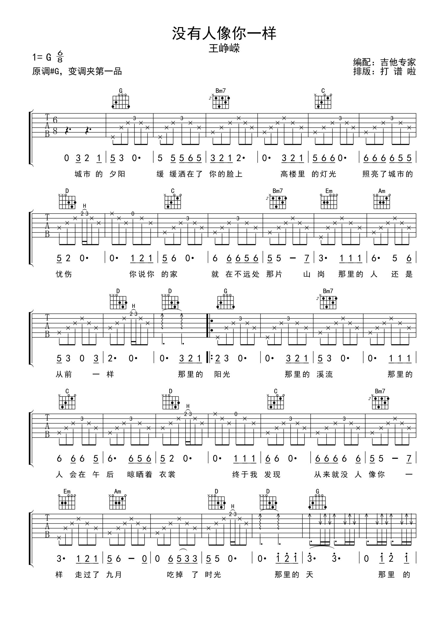 曲谱介绍: 王峥嵘《没有人像你一样》吉他谱_G调吉他弹唱谱