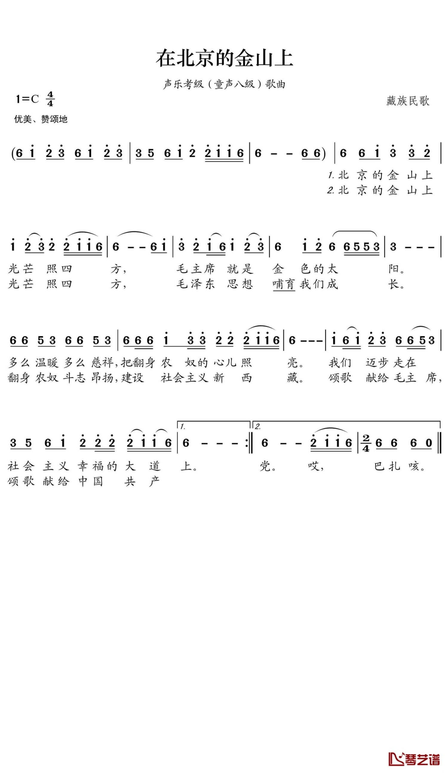 在北京的金山上简谱 - 藏族民歌