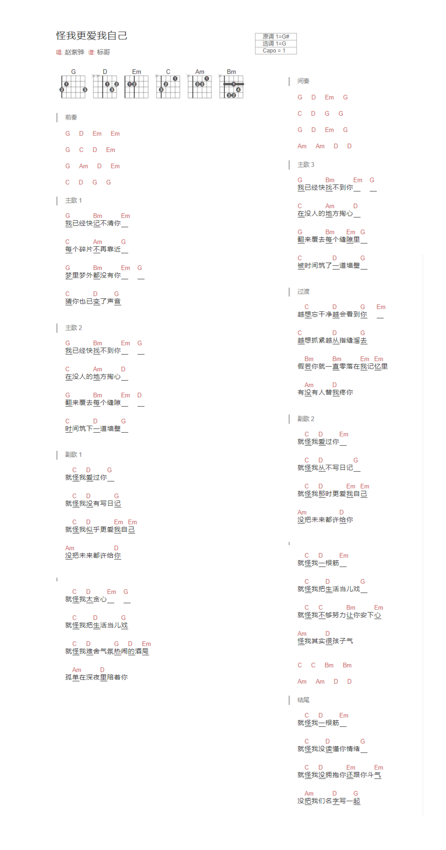 曲谱介绍: 赵紫骅《怪我更爱我自己》吉他谱_G调吉他弹唱谱_和弦谱